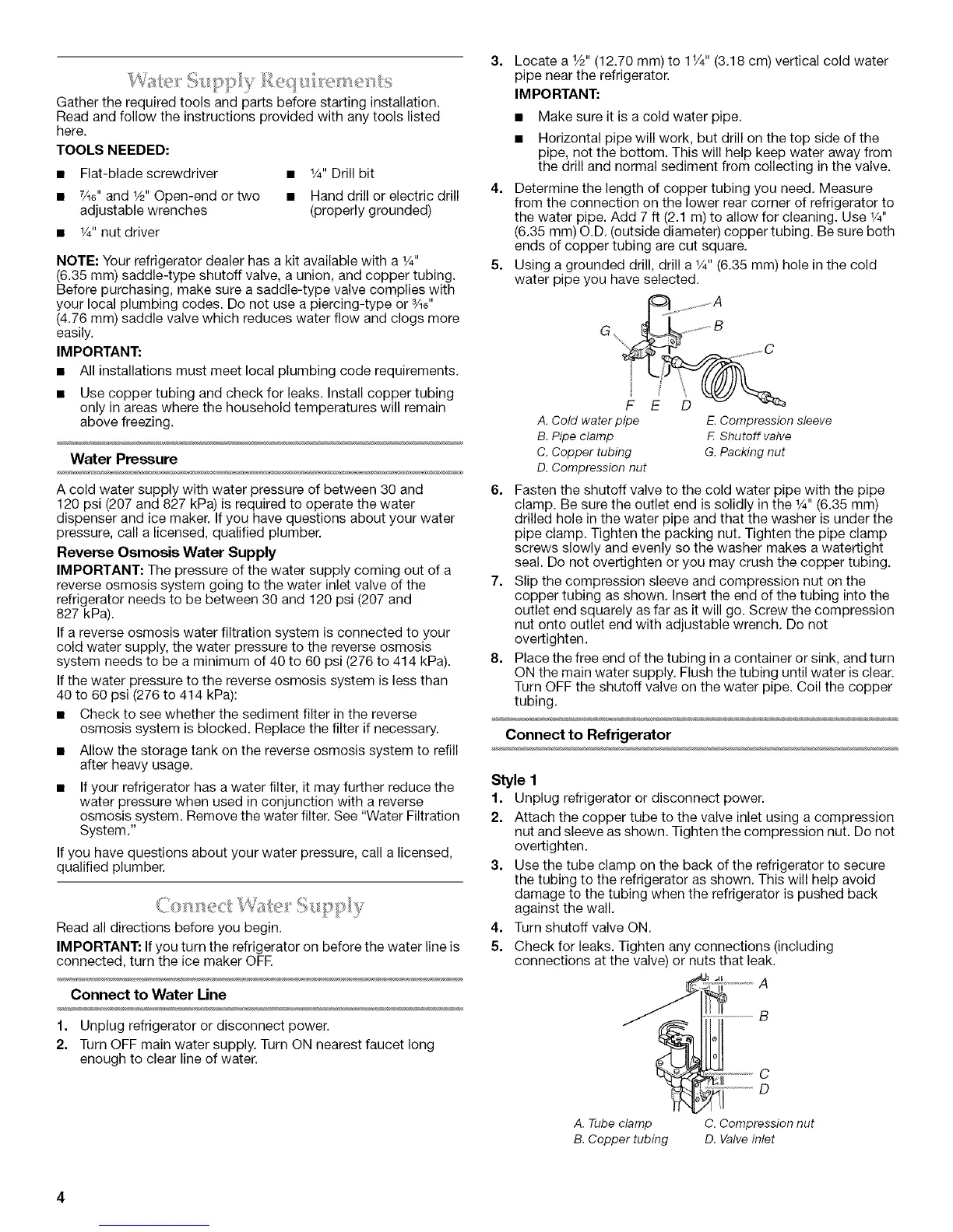 (6.35 mm) saddle-type shutoff valve, a union, and copper tubing.