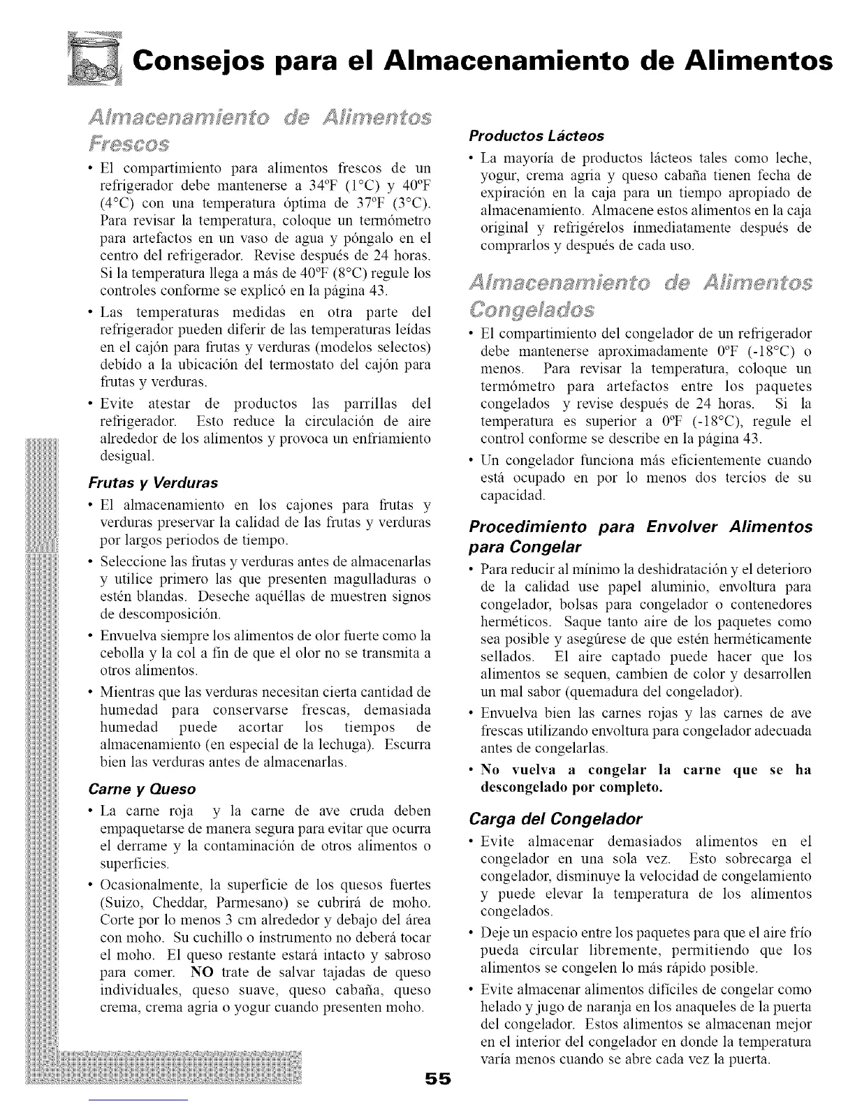 (4°C) con una temperatura 6ptima de 37°F (3°C).