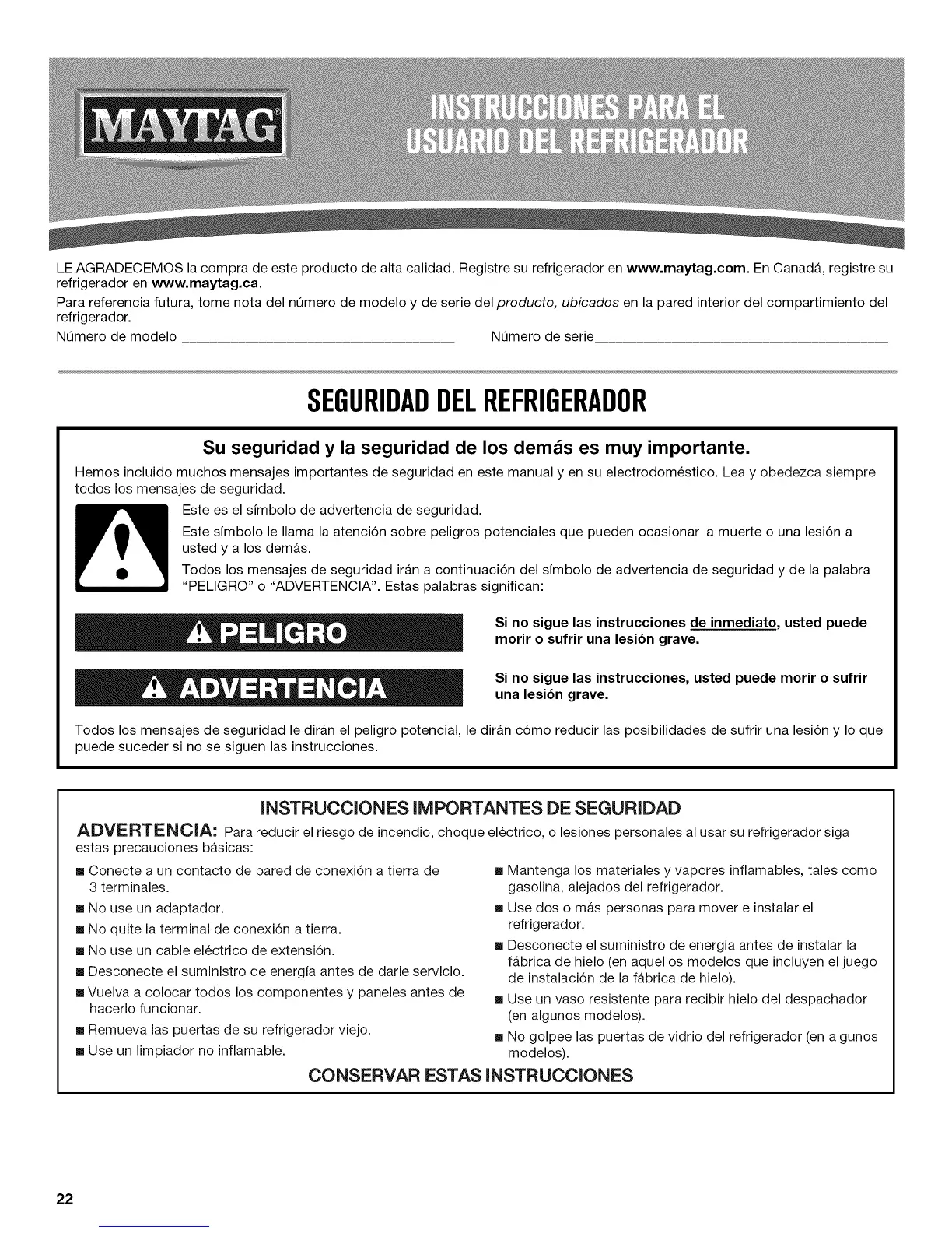 LE AGRADECEMOS la compra de este producto de alta calidad. Registre su refrigerador en www.maytag.com. En CanadA, registre su