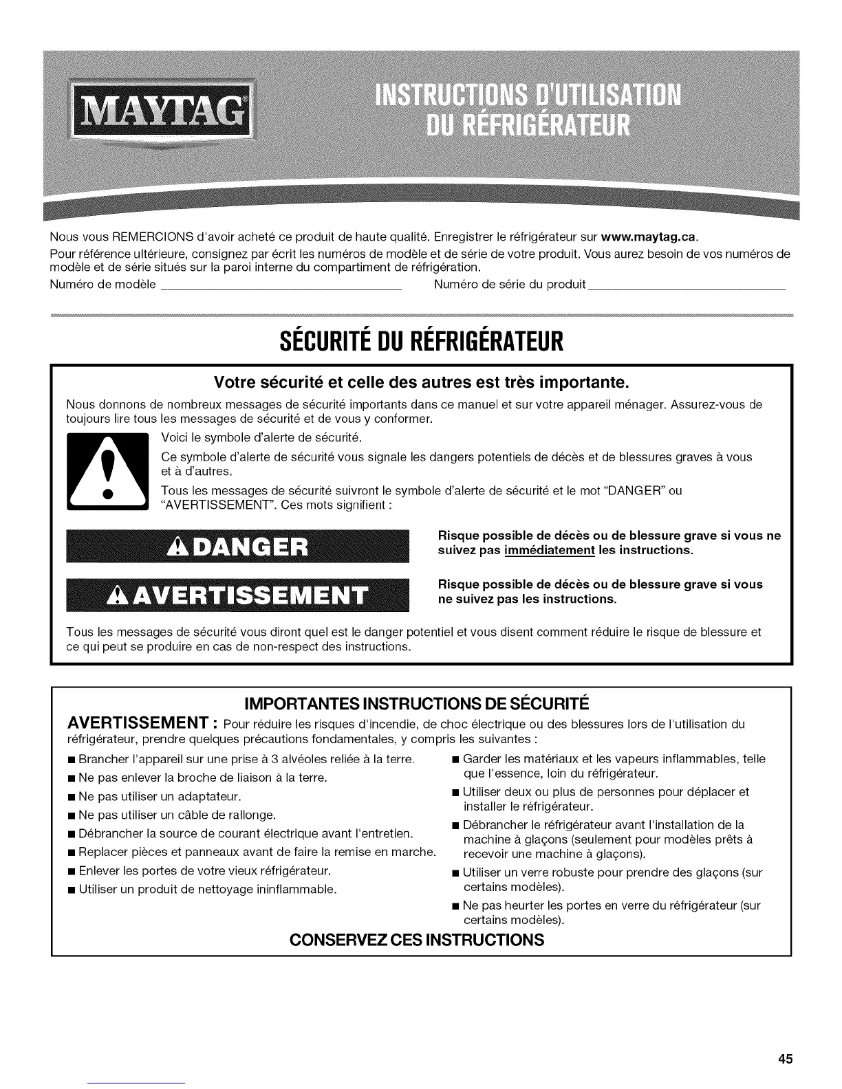 Nous vous REMERCIONS d'avoir achete ce produit de haute qualit& Enregistrer le refrig6rateur sur www.maytag.ca.