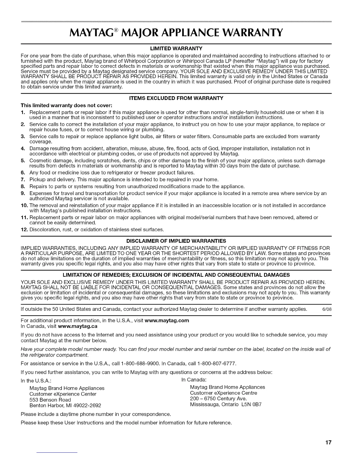 If outside the 50 United States and Canada, contact your authorized Maytag dealer to determine if another warranty applies. 6/o8
