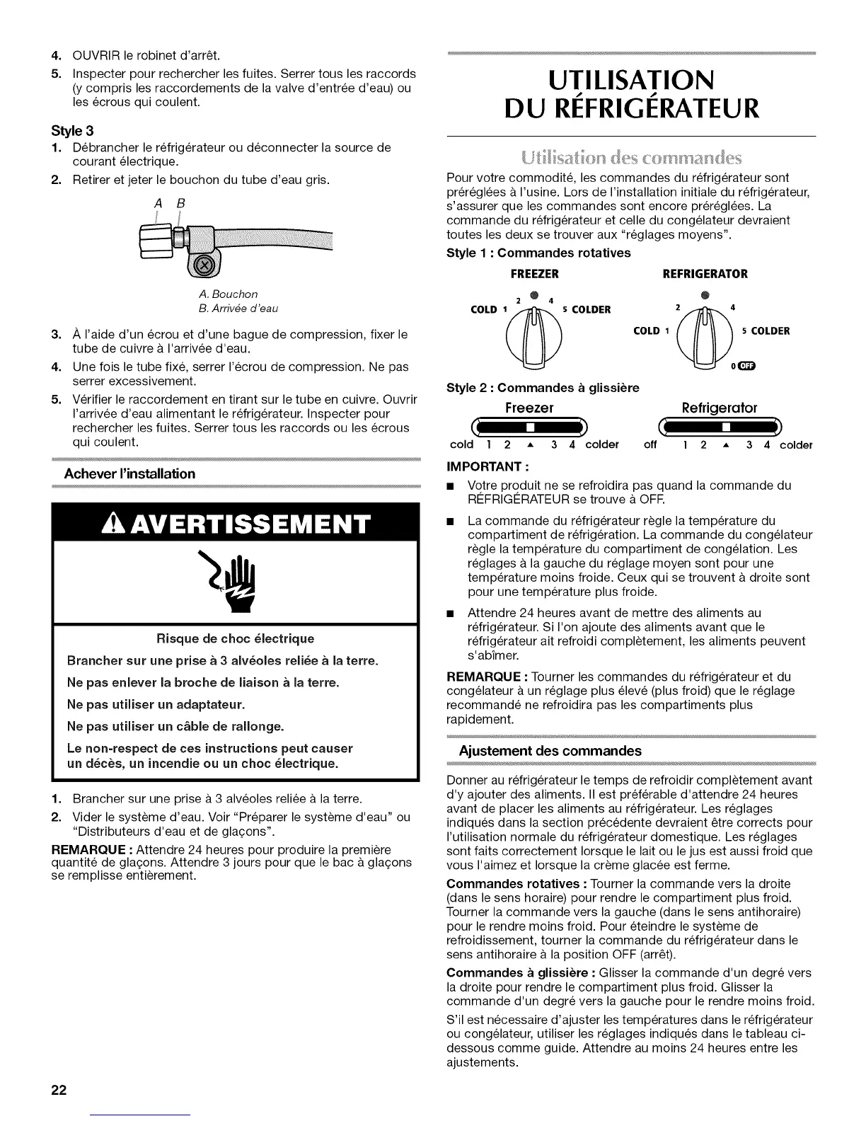 REMARQUE : Tourner les commandes du refrigerateur et du