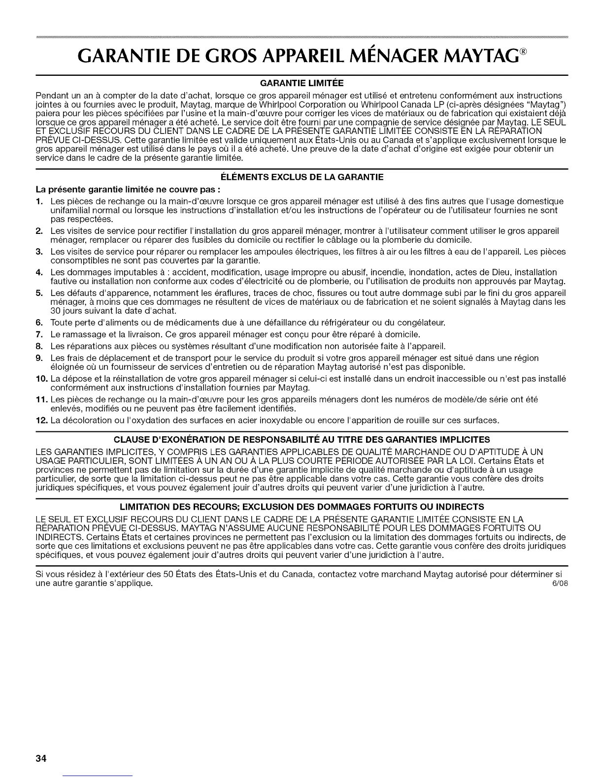 jointes a ou fournies avec le produit, Maytag, marque de Whirlpool Corporation ou Whirlpool Canada LP (ci-apres designees "Maytag")