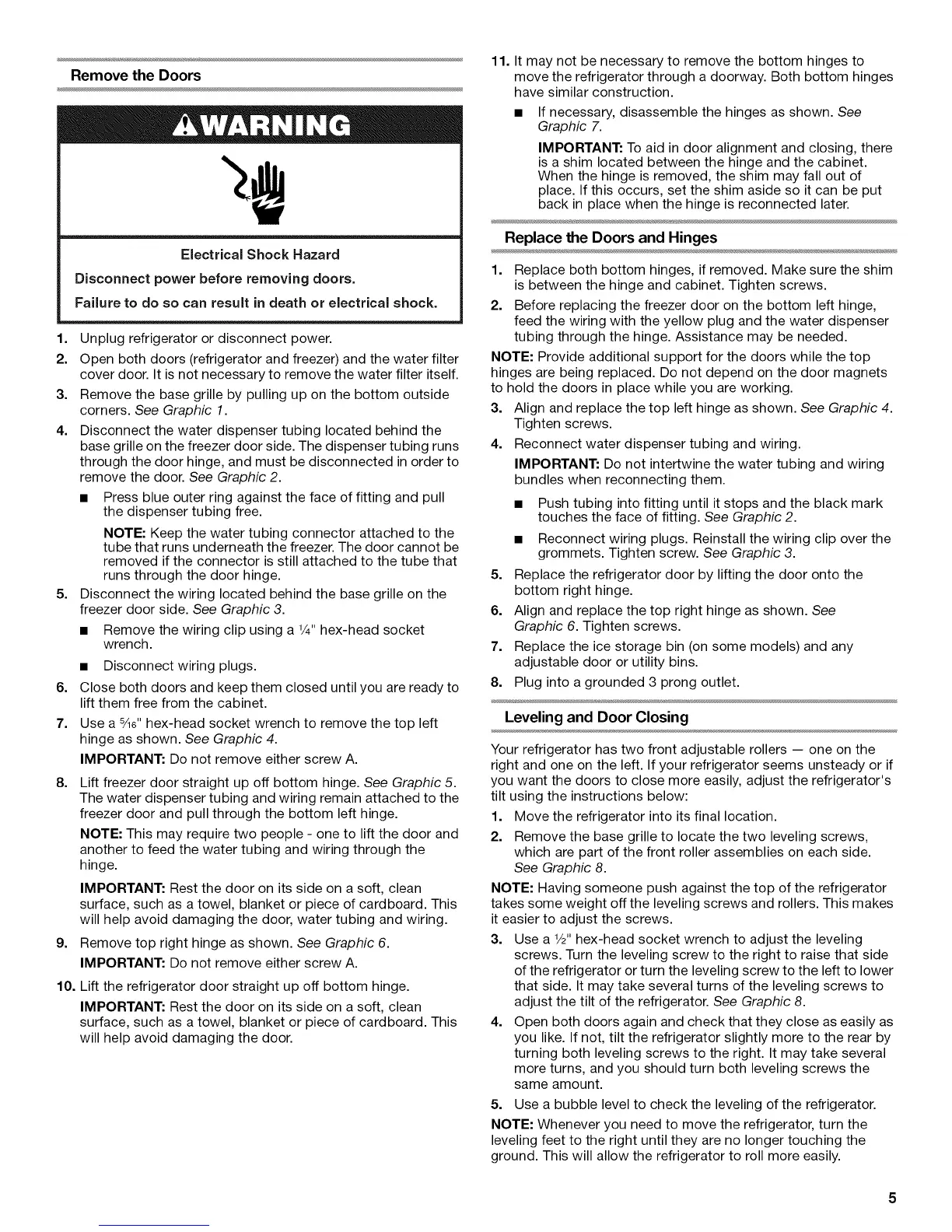 8. Lift freezer door straight up off bottom hinge. See Graphic 5.
