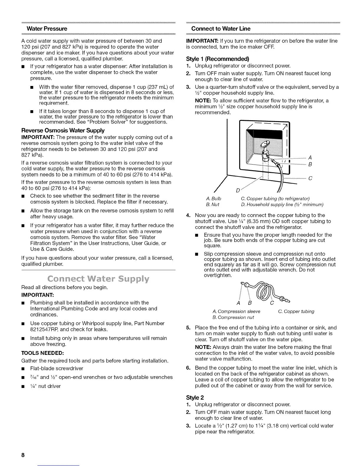 • Use copper tubing or Whirlpool supply line, Part Number