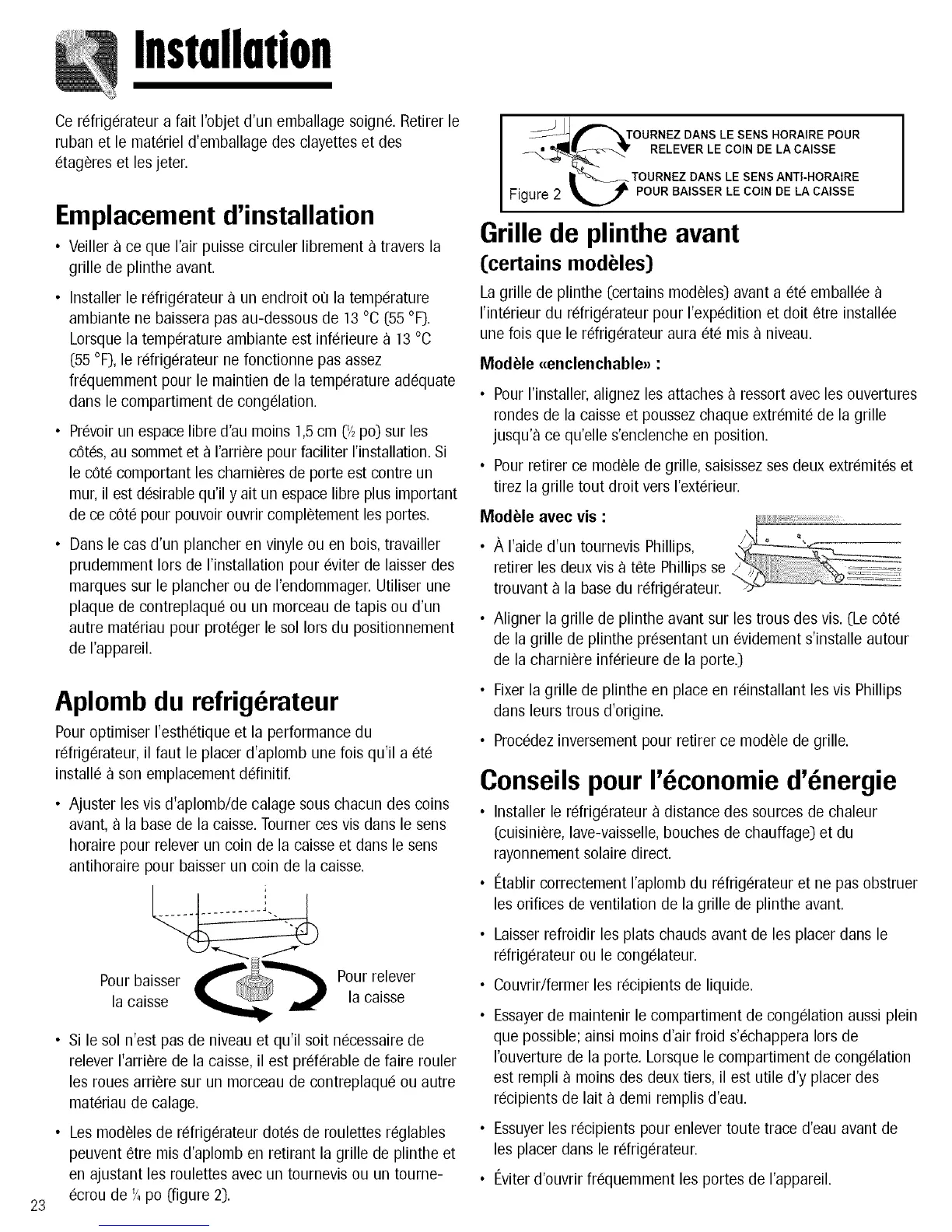 • I_tablir correctement I'aplomb du rdrigerateur et ne pas obstruer