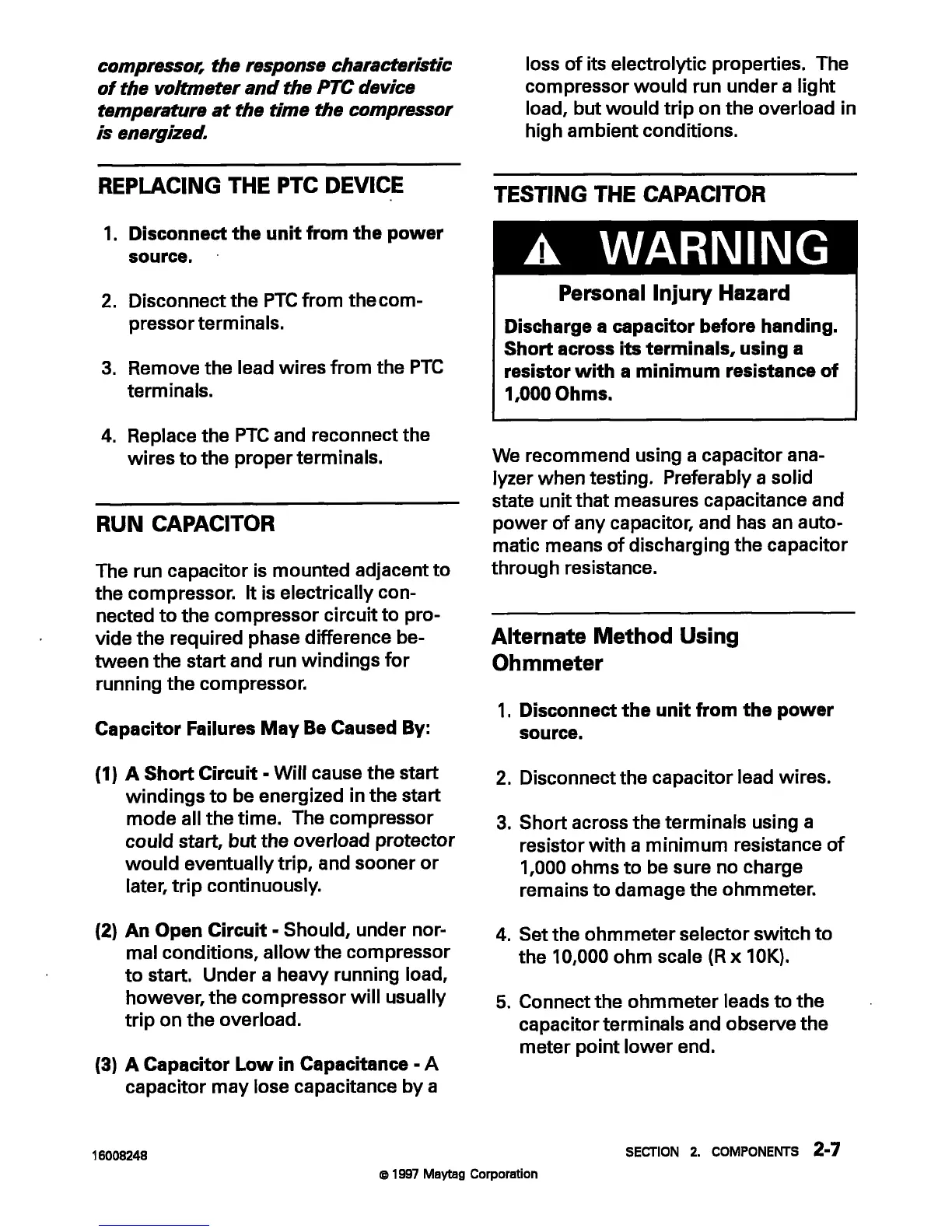 Maytag MTB1954 - Replacing the PTC Device; Testing the Capacitor; Run Capacitor; Alternate Method Using Ohmmeter