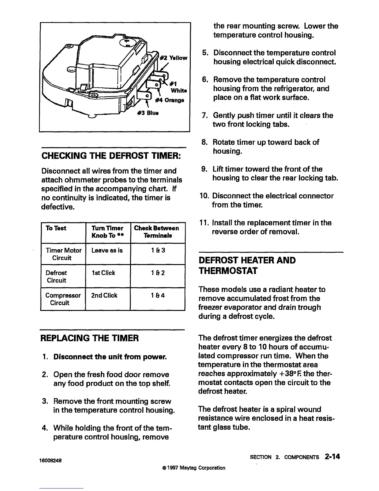 Maytag MTB1954 - Checking the Defrost Timer; Replacing the Timer; Defrost Heater and Thermostat