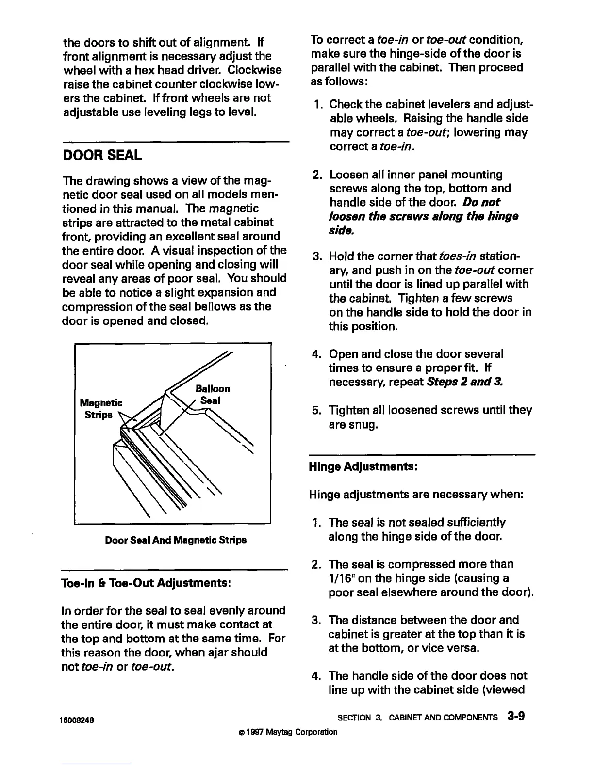 Maytag MTB1954 - Door Seal; Toe-In & Toe-Out Adjustments; Hinge Adjustments; Door Seal and Magnetic Stripe