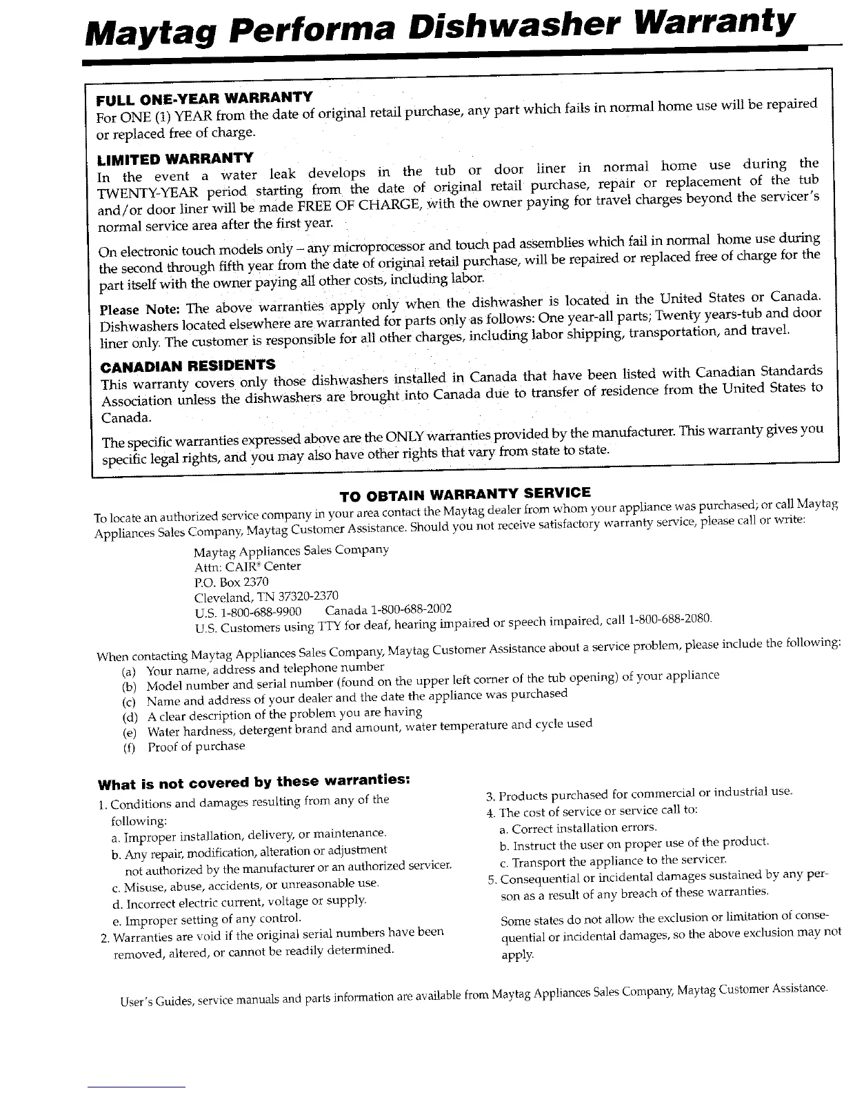User's Guides, servicemanuals and parts information are availablefrom Maytag Appliances SalesCompany, MaytagCustomer Assistance.
