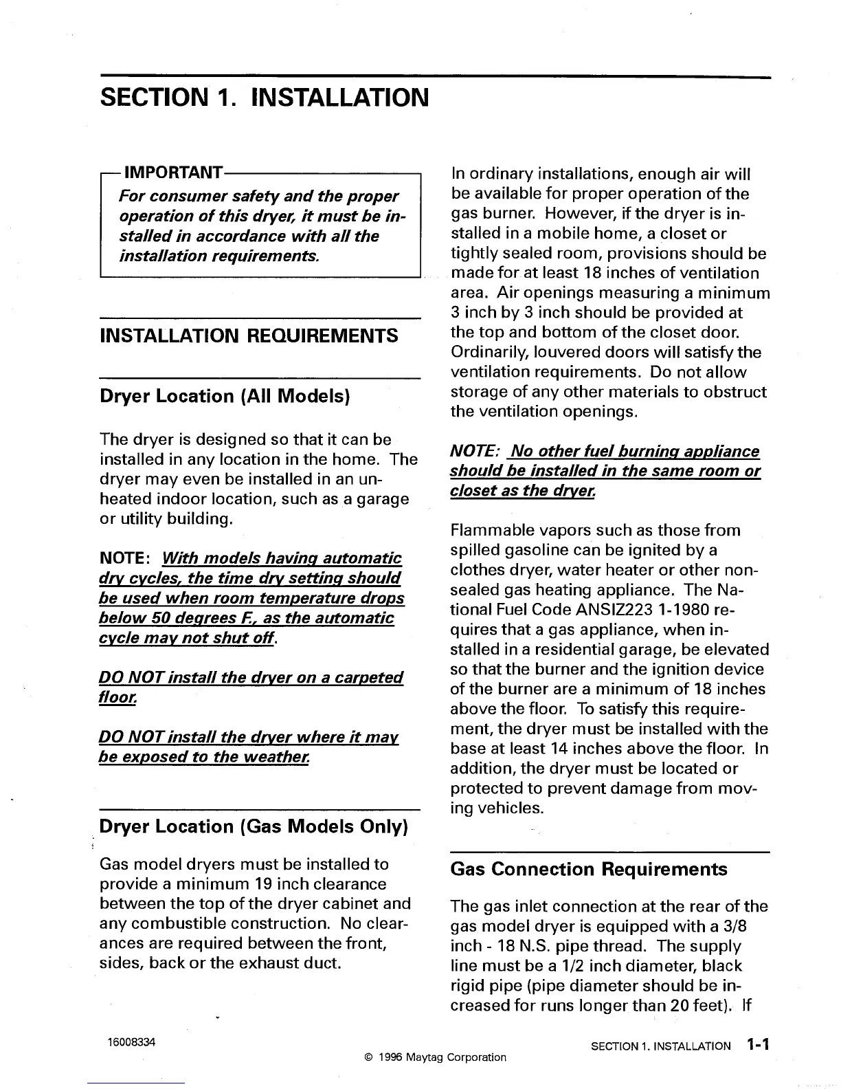 Maytag Performa PYG3200 - Section 1. Installation; Installation Requirements