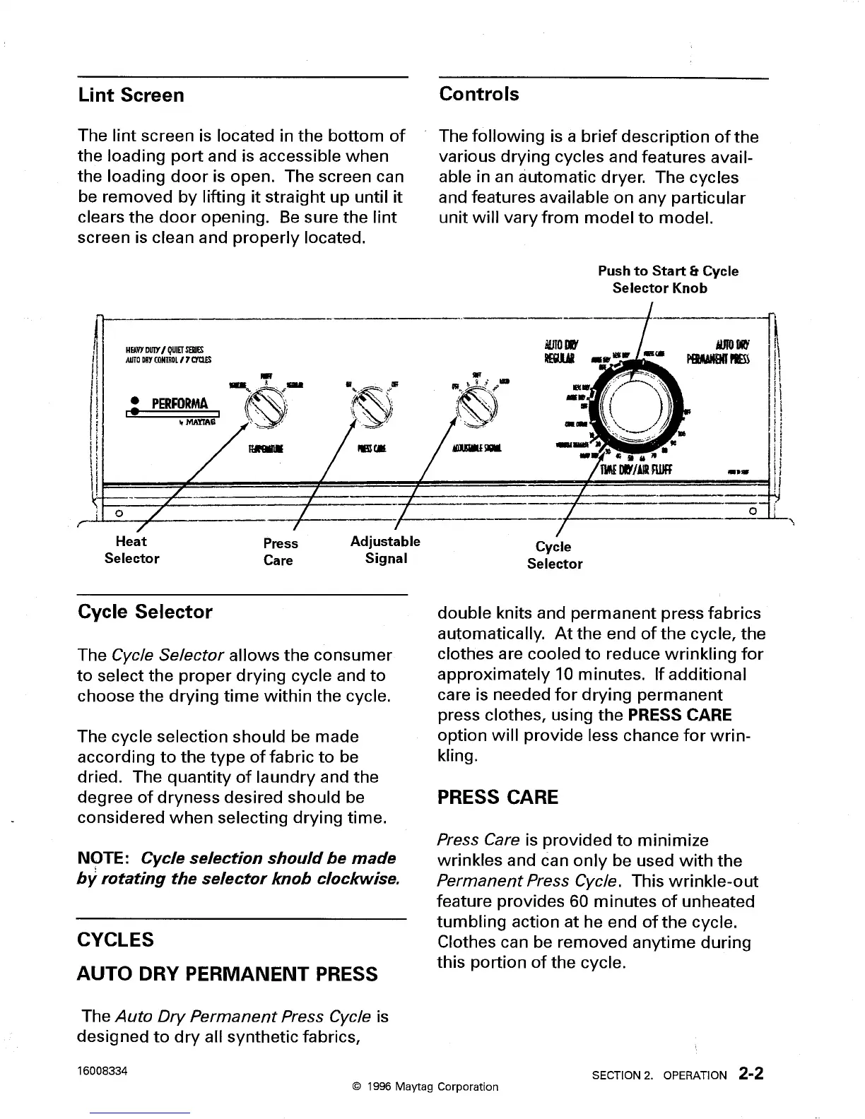 Maytag Performa PYG3200 - Press Care; Controls; Auto Dry Permanent Press; Cycles