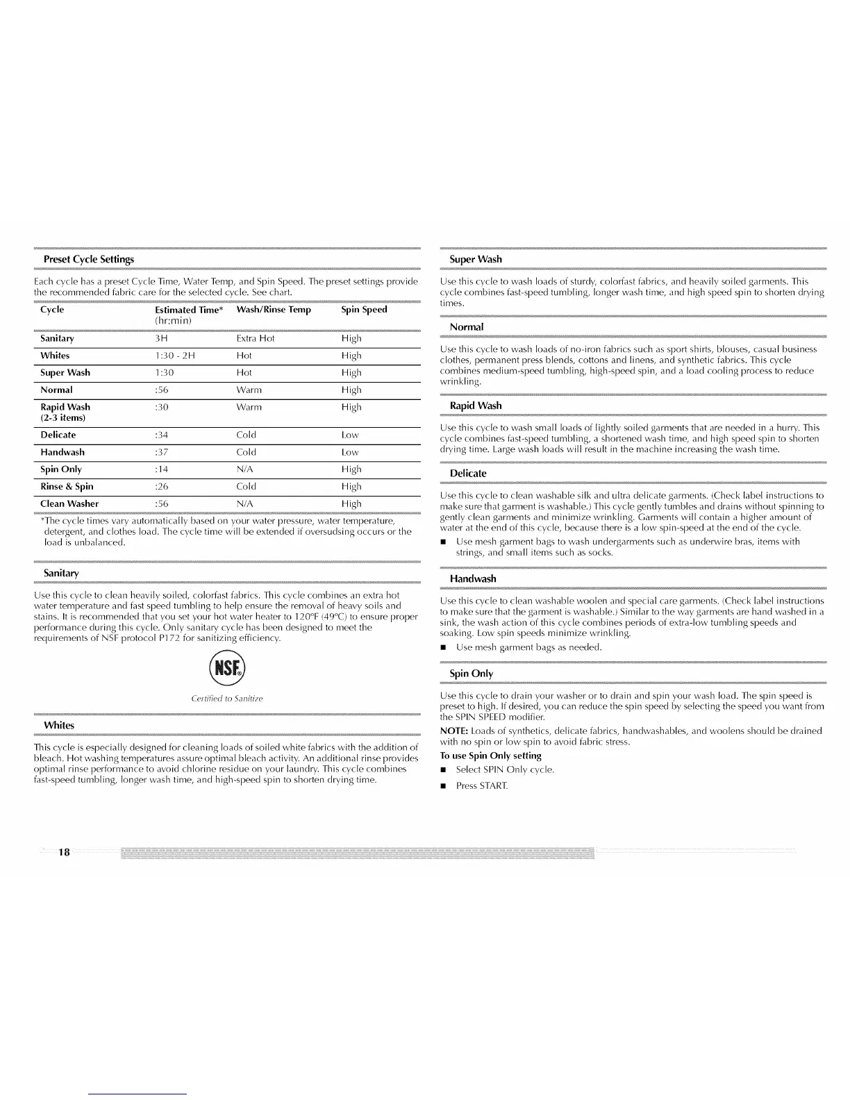 Each cycle has a preset Cycle Time, Water Temp, and Spin Speed. The preset settings provide