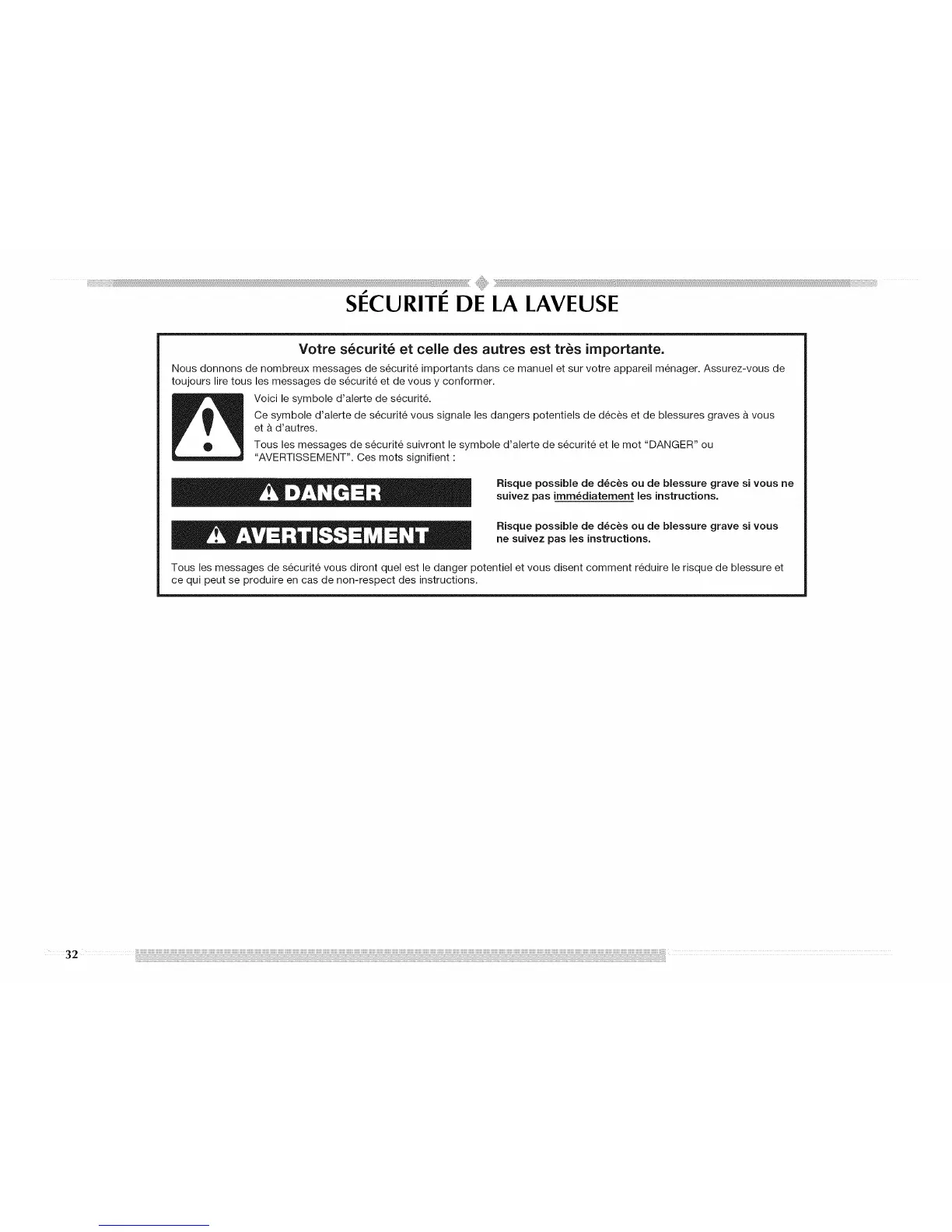 Nous donnons de nombreux messages de s_curit_ importants dans ce manuel et sur votre appareil m_nager. Assurez-vous de