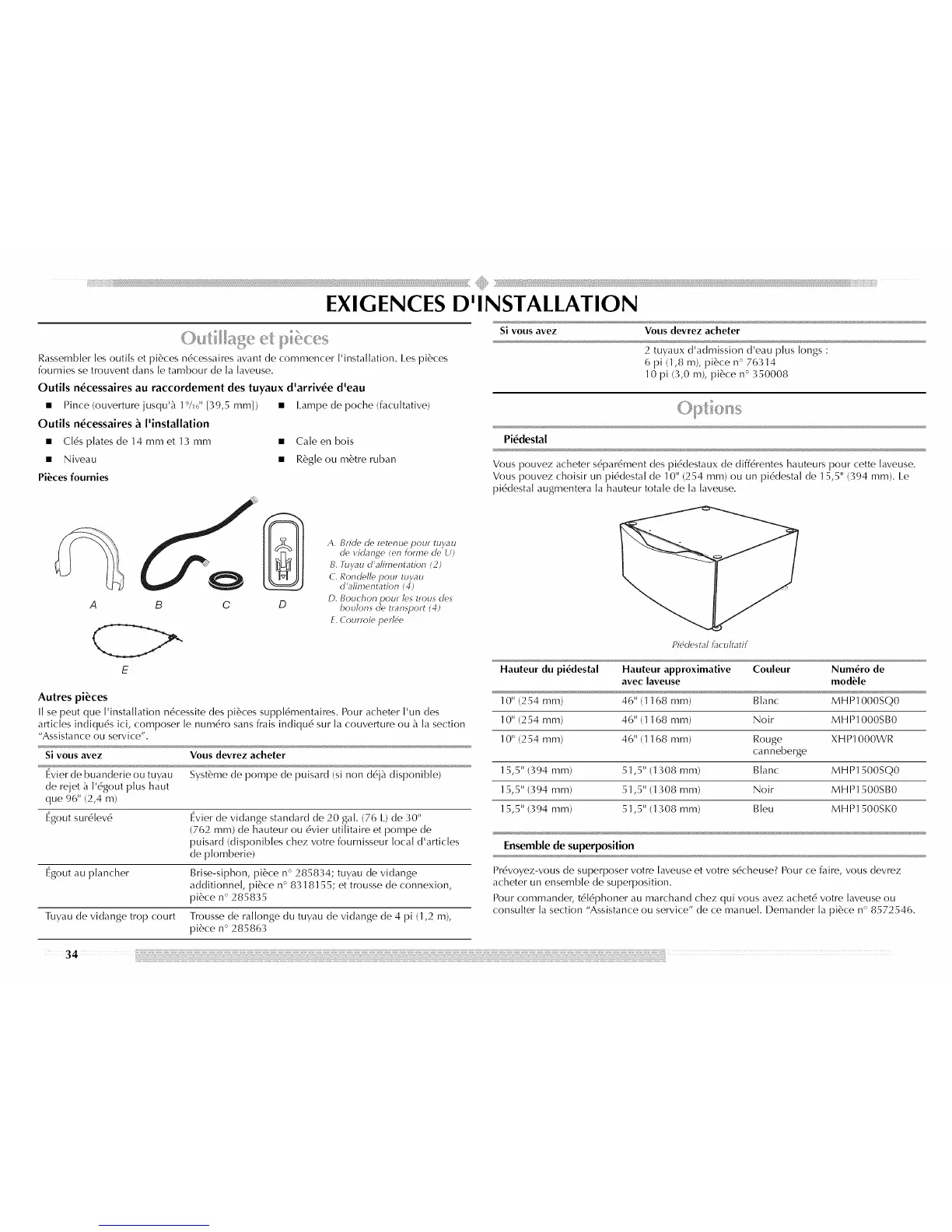 Vous pouvez choisir un pi6desta[ de 10" (254 mm) ou un pi6desta[ de 15,5" (394 mm). I.e