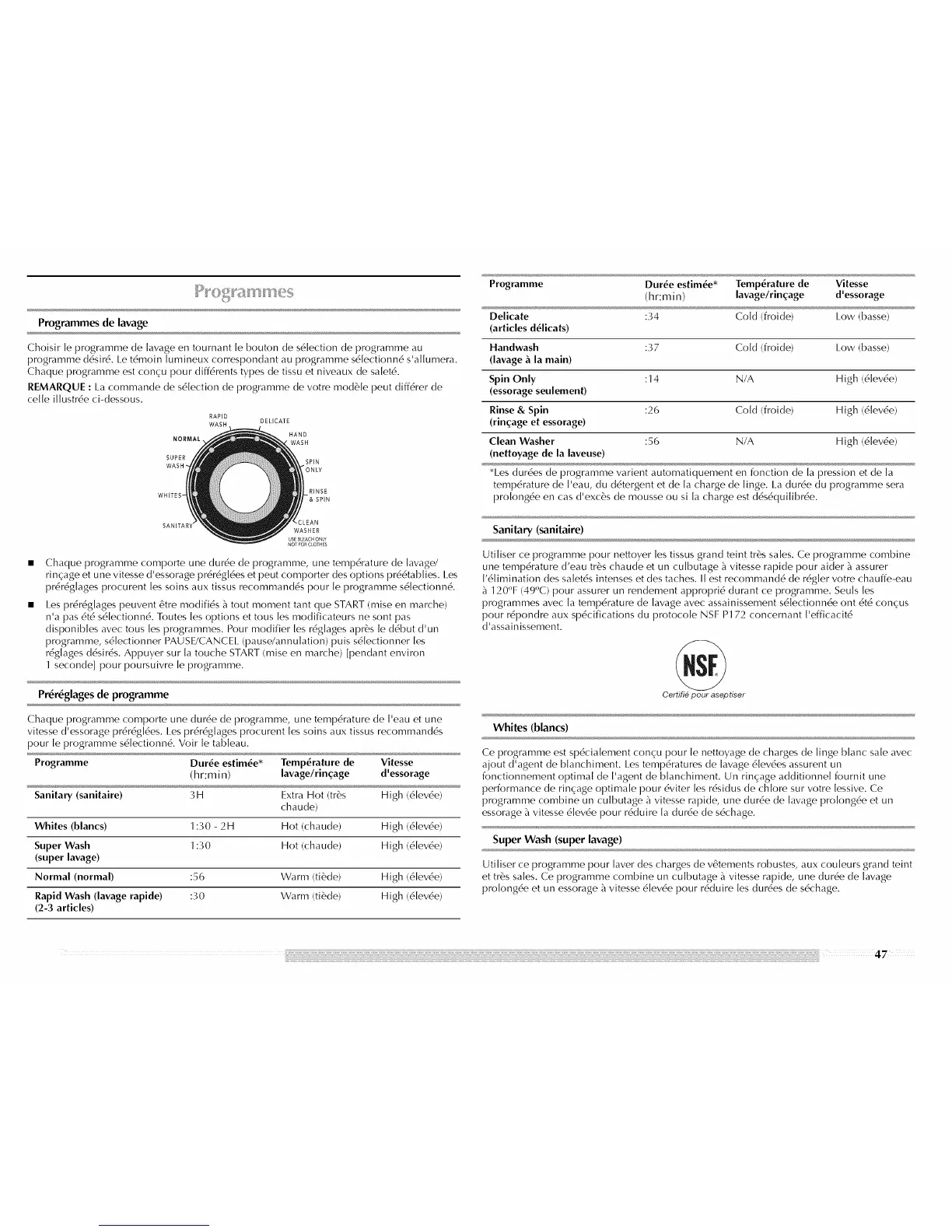temp6rature de ['eau, du d6tergent et de [a charge de [inge. La dur6e du programme sera