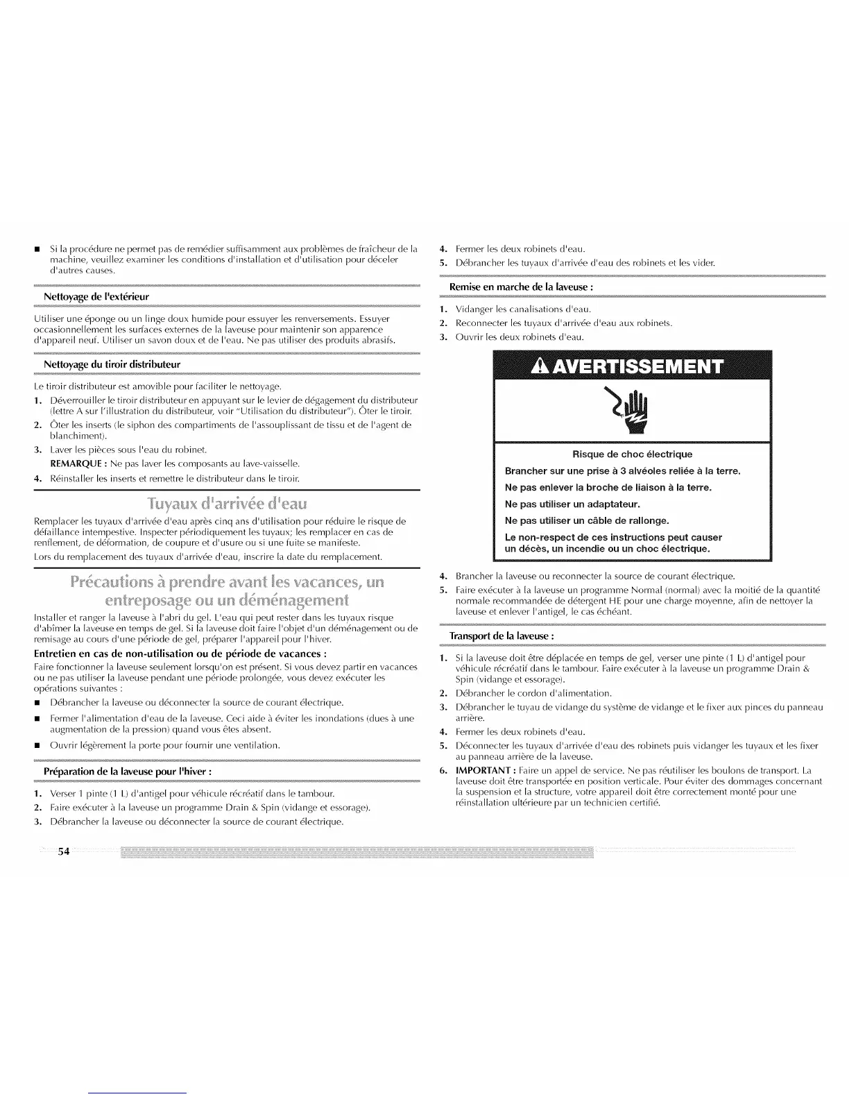 d'ab?mer la laveuse en temps de gel. Si la laveuse doit faire I'objet d'un d6m6nagement ou de