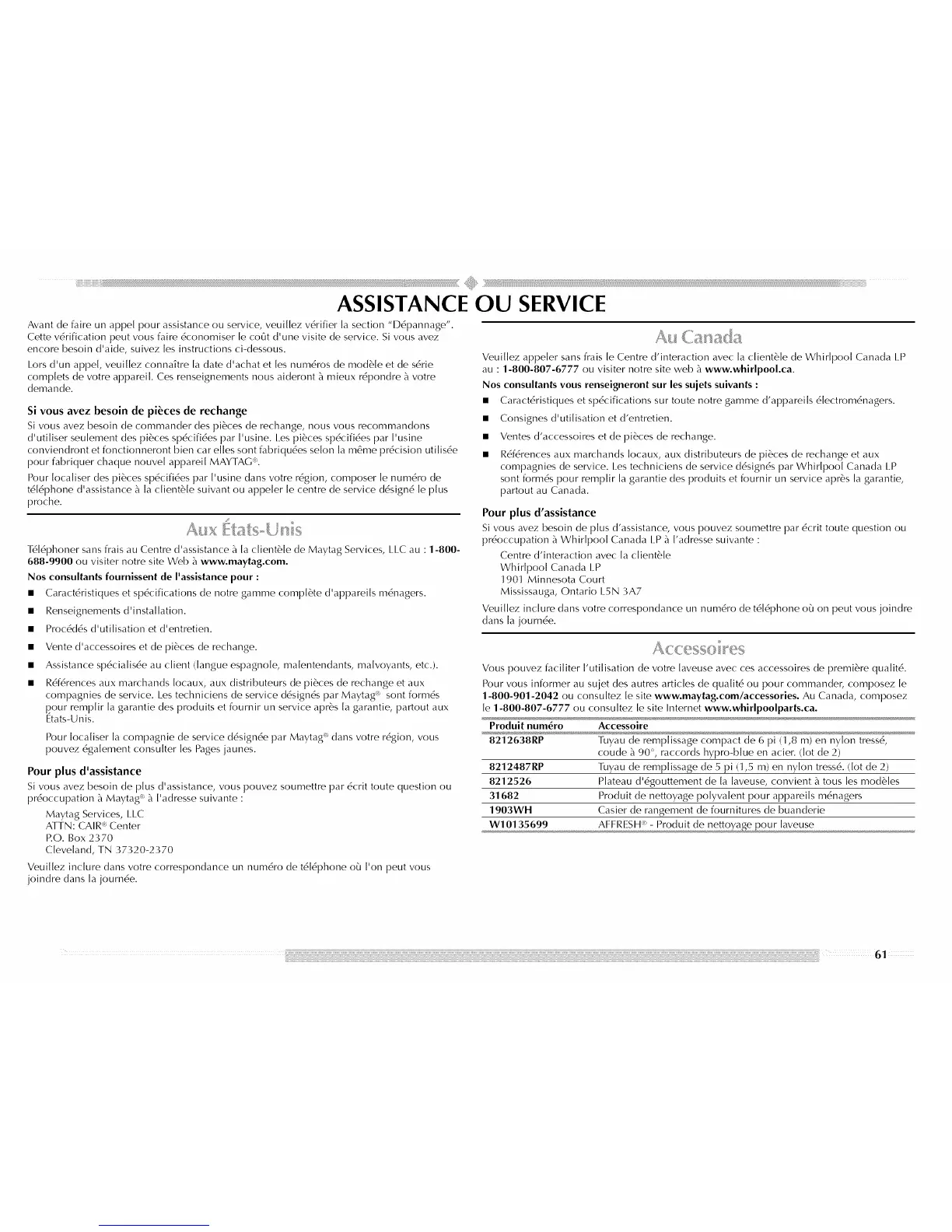 T616phoner sans frais au Centre d'assistance b_la clientele de Maytag Services, I.I.C au : 1-800-