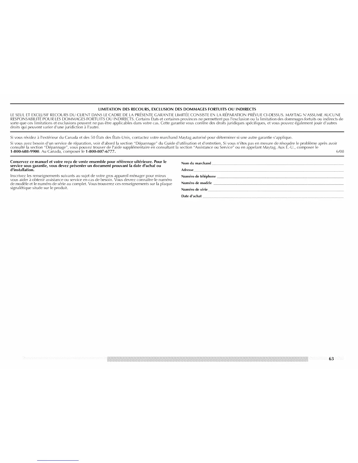 LESEUI. ET EXCI.USIF RECOURS I)U CLIENT DANS LE CADRE DE LA PRESENTEGARANTIE I.IMITEE CONSISTE EN LA REPARATION PREVUECI-DESSUS. MAYTAG N'ASSUME AUCUNE