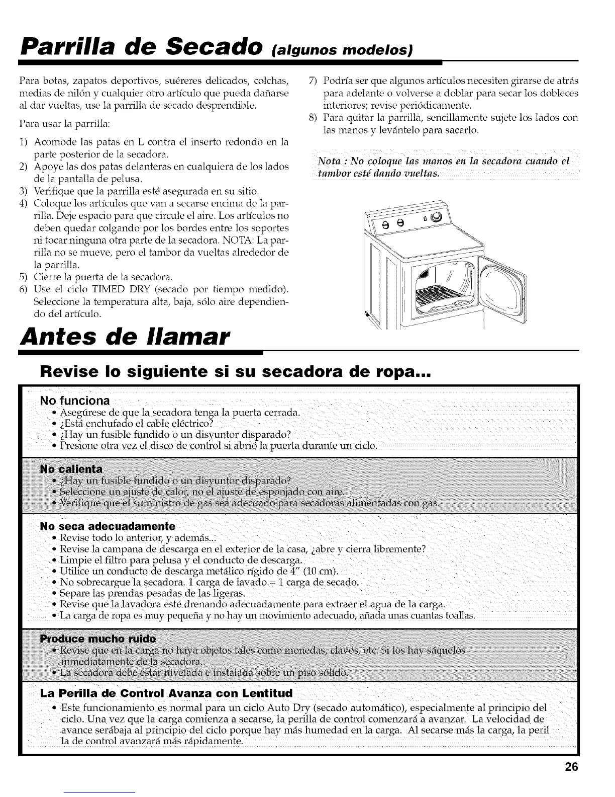 Nota :No Coloqu e las inanos en !a secadora Cuando e!