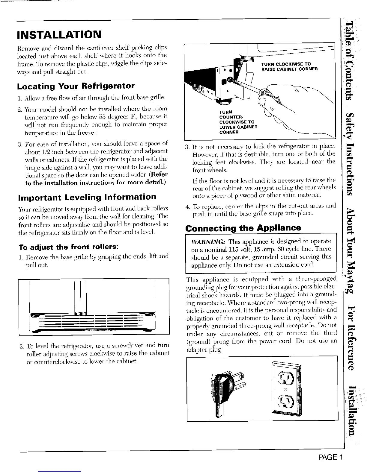 2. To level the refrigerator, nse a screwdriver and turn (ground) prong fi'om the power cord. Do not use an