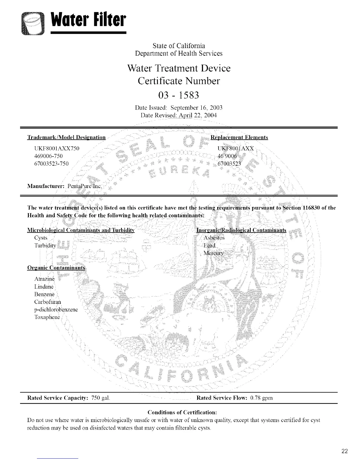 Rated Service CapaciD: 750 gal. Rated Service Flow: 0.78 gpm