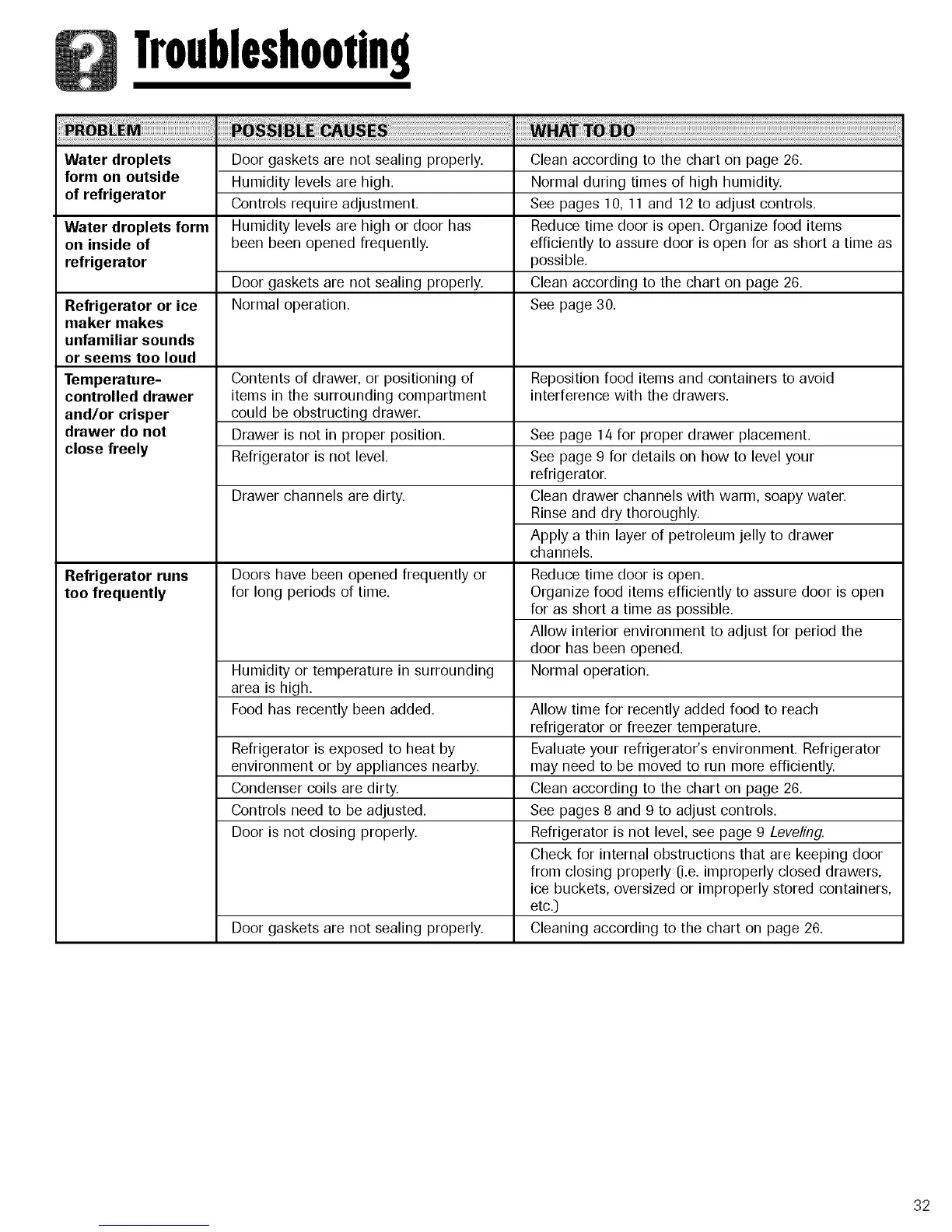 Water droplets Door gaskets are not sealing properly. Clean according to the chart on page 26.