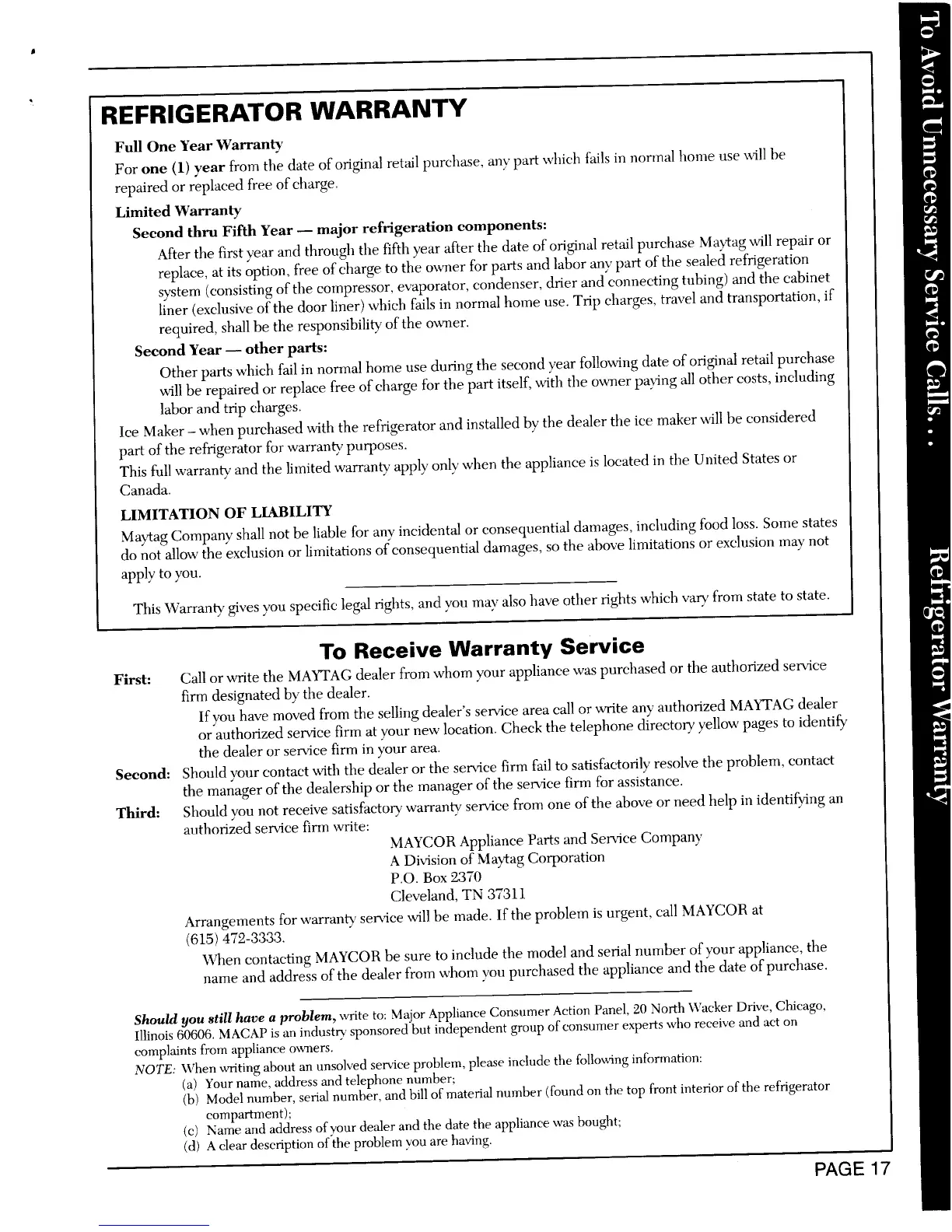 When contacting MAYCOR be sure to include the model and serial number of your appliance, the
