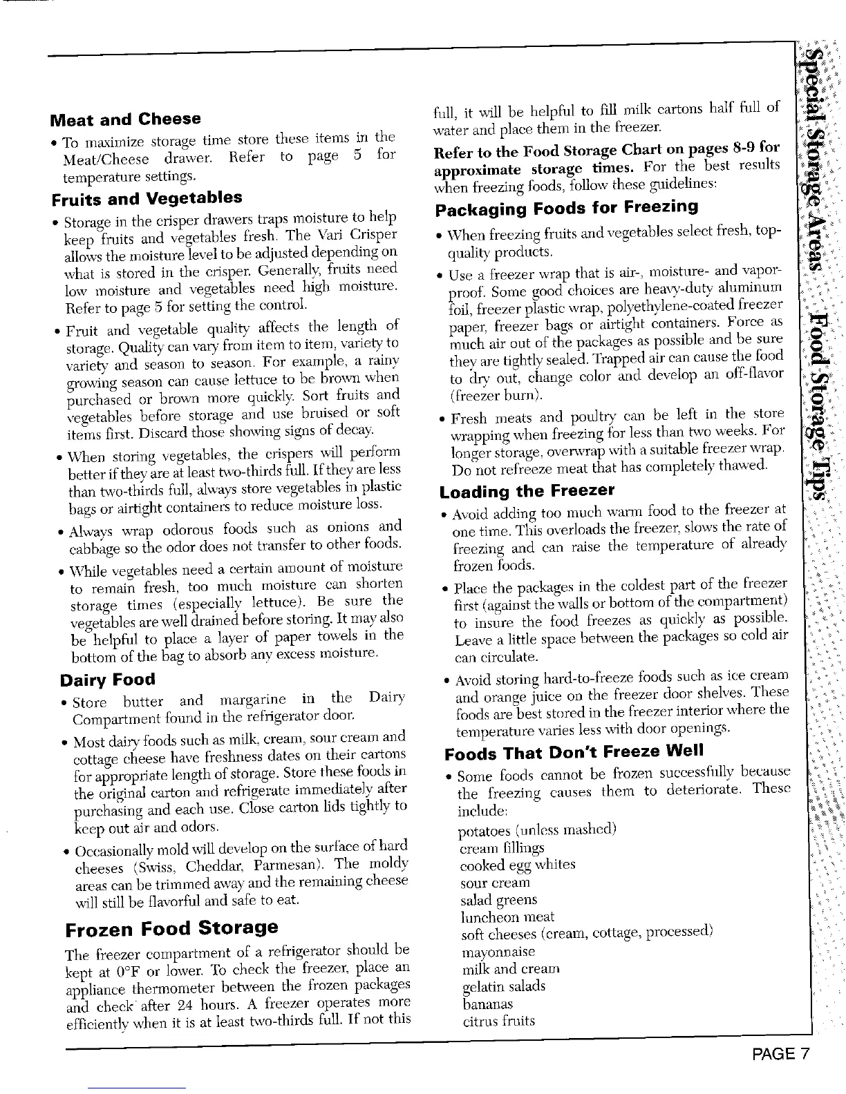 Meat/Cheese drawer. Refer to page 5 for Refer to the Food Storage Chart on pages 8-9 for