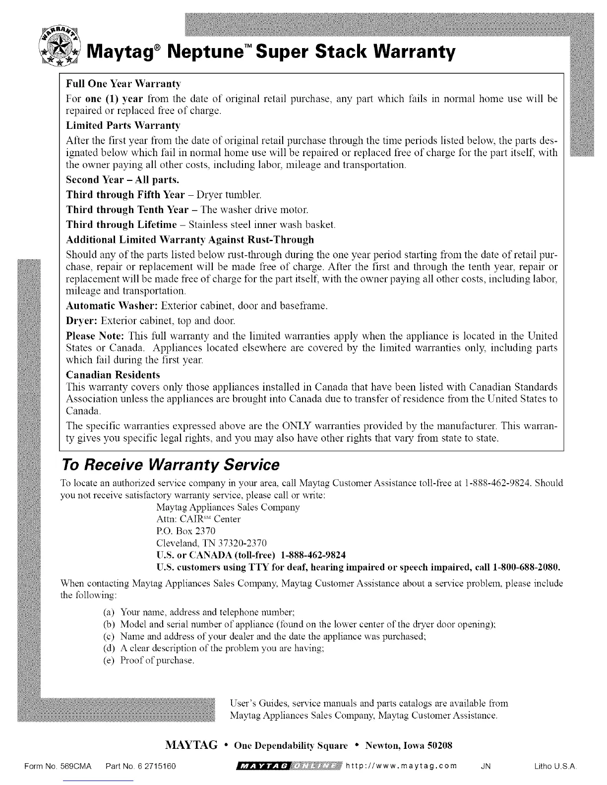 htt p://www.maytag.com JN Litho U.S.A.Form No. 569CMA Part No. 6 2715160