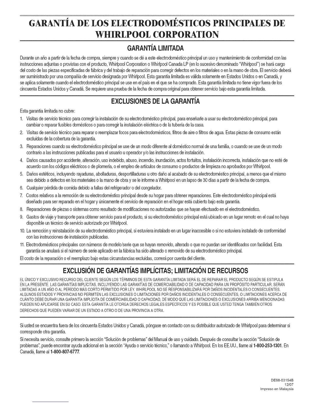 setsuministradoporunacompaSiadeserviciodesignadaporWhirlpool.Estagarantialimitadaesv_.lidasolamenteenEstadosUnidoso enCanada.,y