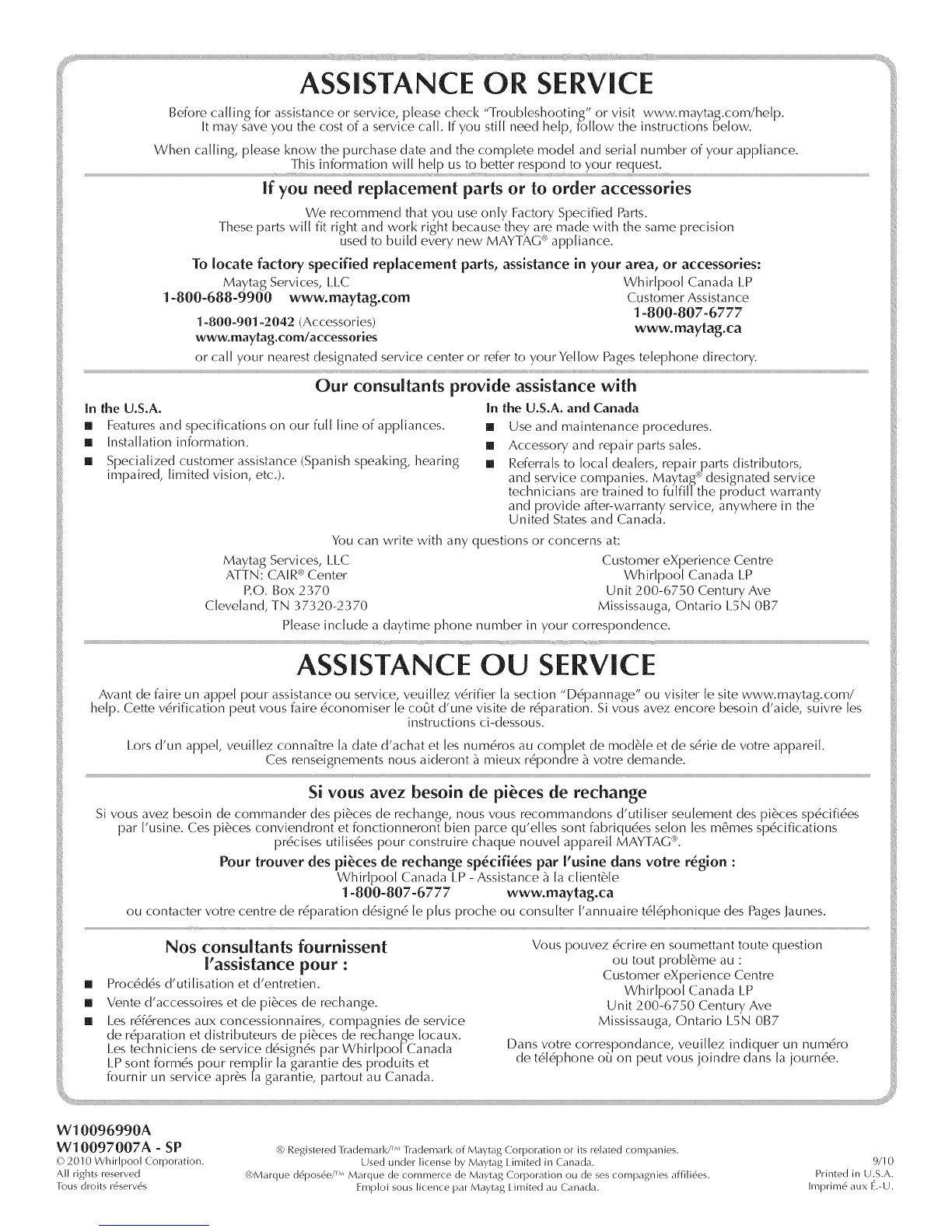 Avant de faire un appe[ pour assistance ou service, veui[[ez v6rifier [a section "D6pannage" ou visiter [e site www.maytag.com/