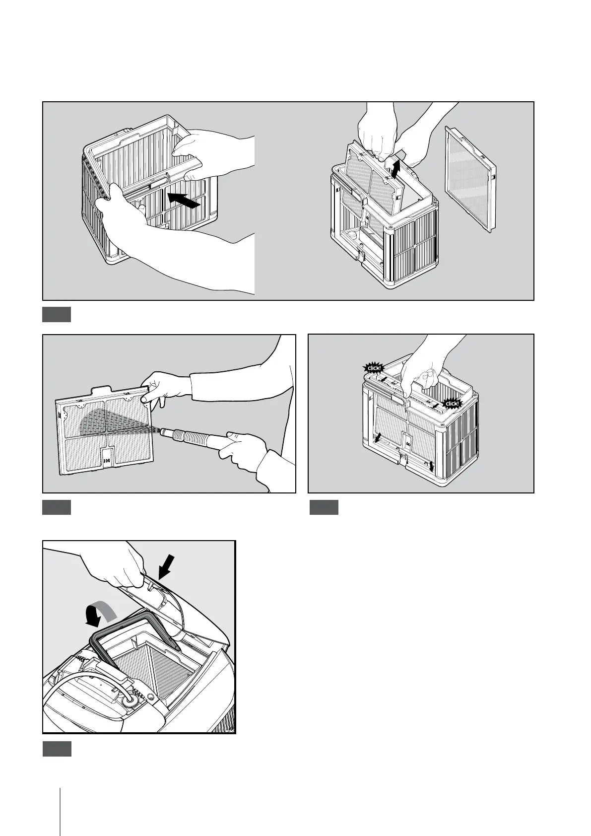 Desmonte os 2 painéis dos filtros ultrafinos do cesto, seguindo os passos abaixo: