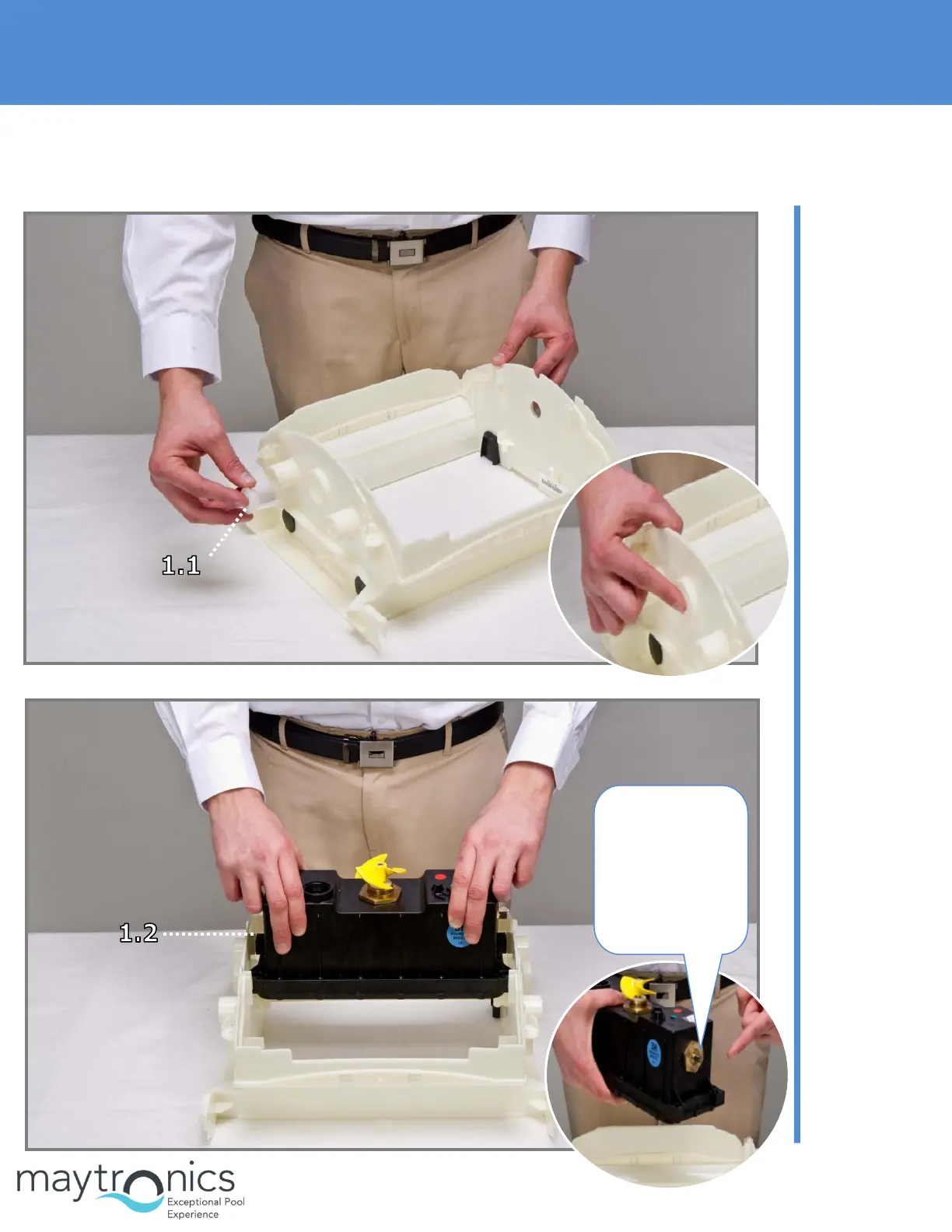 Maytronics Supreme M3 - 1. Assembling the Motor Unit; Step 1.1 Assemble the cover cork into the Pulleys place; Step 1.2 Place the motor unit in its place