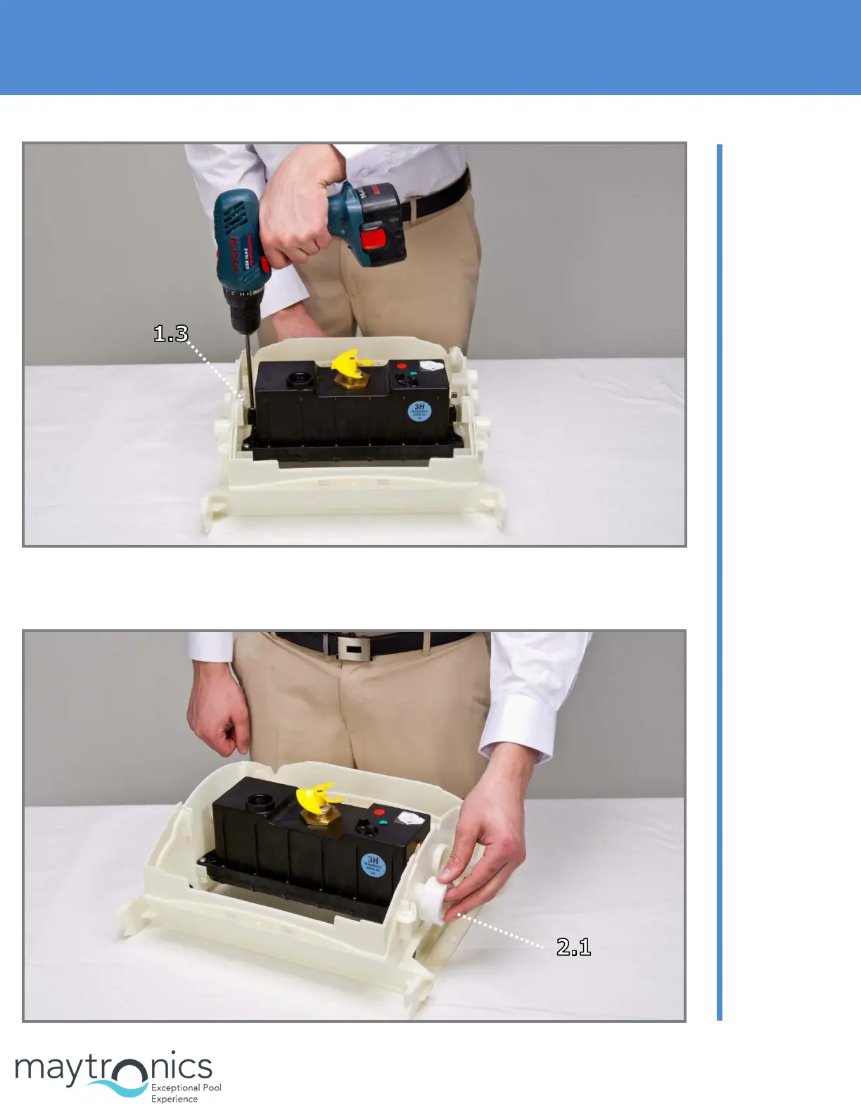 Maytronics Supreme M3 - Step 1.3 Secure the motor unit to the frame with 4 X KA50 X30; 2. Assembling the Driving System and Side Cover; Step 2.1 Place the guide wheels on the side of the motor shaft