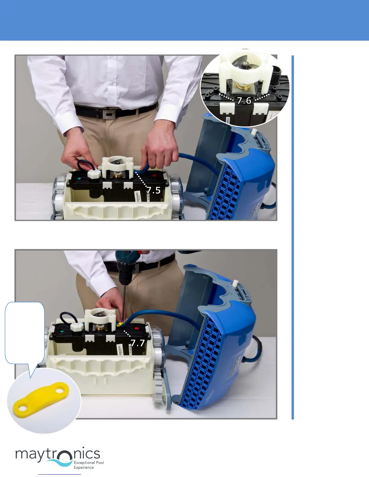 Maytronics Supreme M4 - Step 7.5: Position floating cable; Step 7.6: Cable position on motor unit; Step 7.7: Secure cable holders
