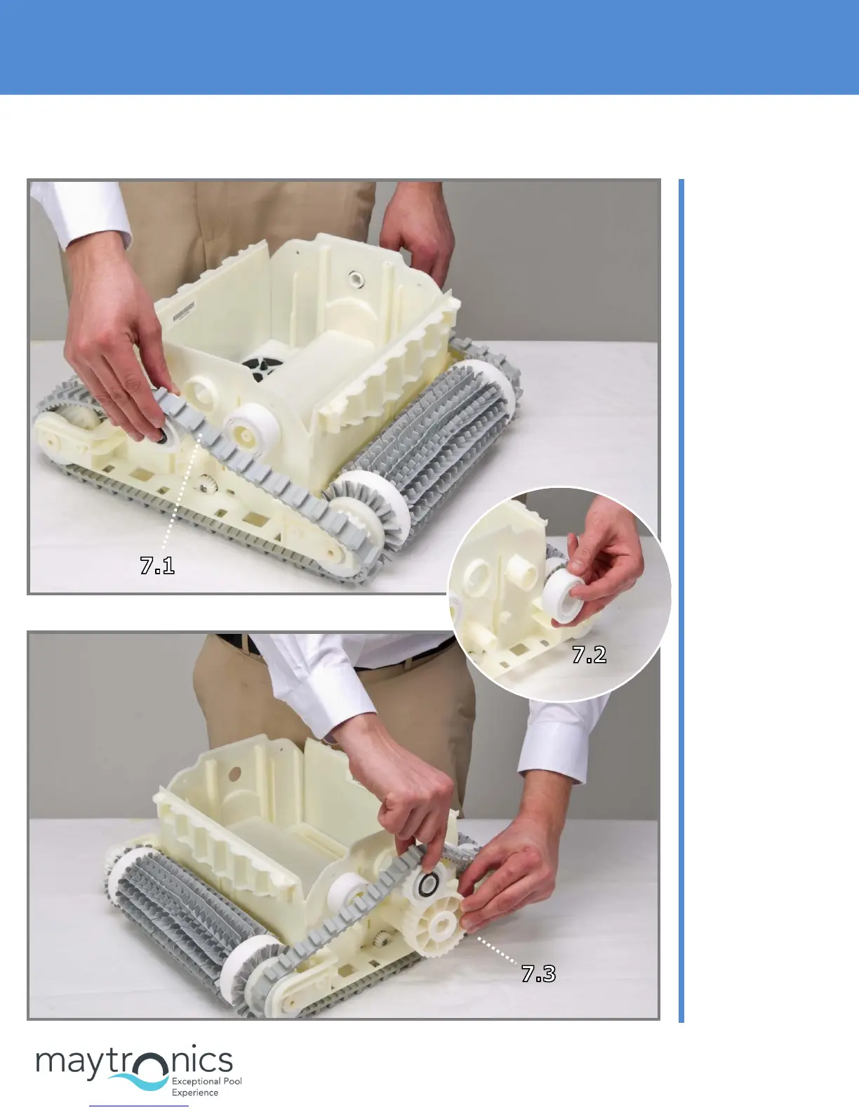 Maytronics Supreme M4 - 7. Dismantling the Driving System; Step 7.1: Remove pulley and track from one side; Step 7.2: Remove guide wheels; Step 7.3: Remove pulley, track, and drive wheel from other side