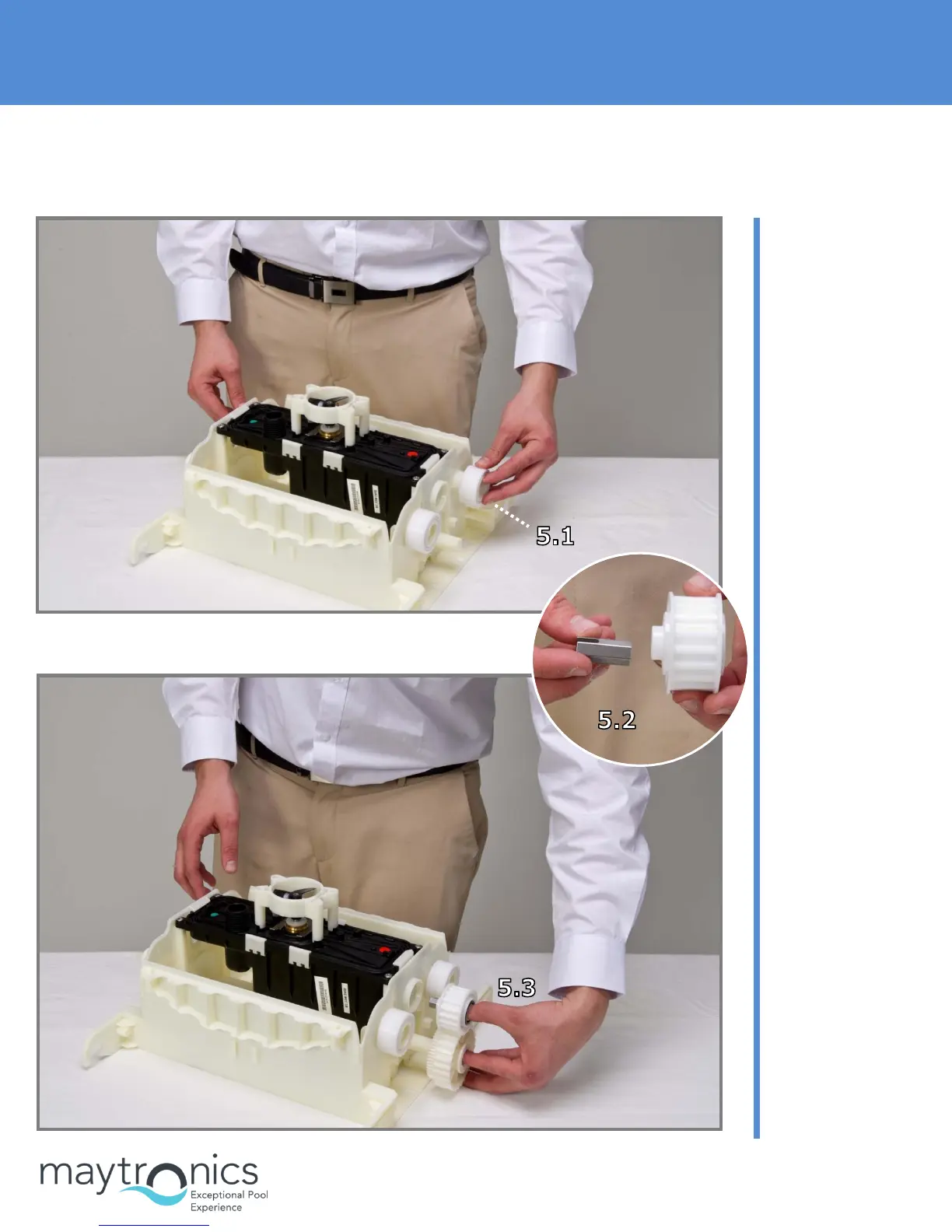 Maytronics Supreme M4 - 5. Assembling the Driving System and Side Cover; Step 5.1: Place guide wheels; Step 5.2: Insert hexagon adaptor; Step 5.3: Position pulley and gear