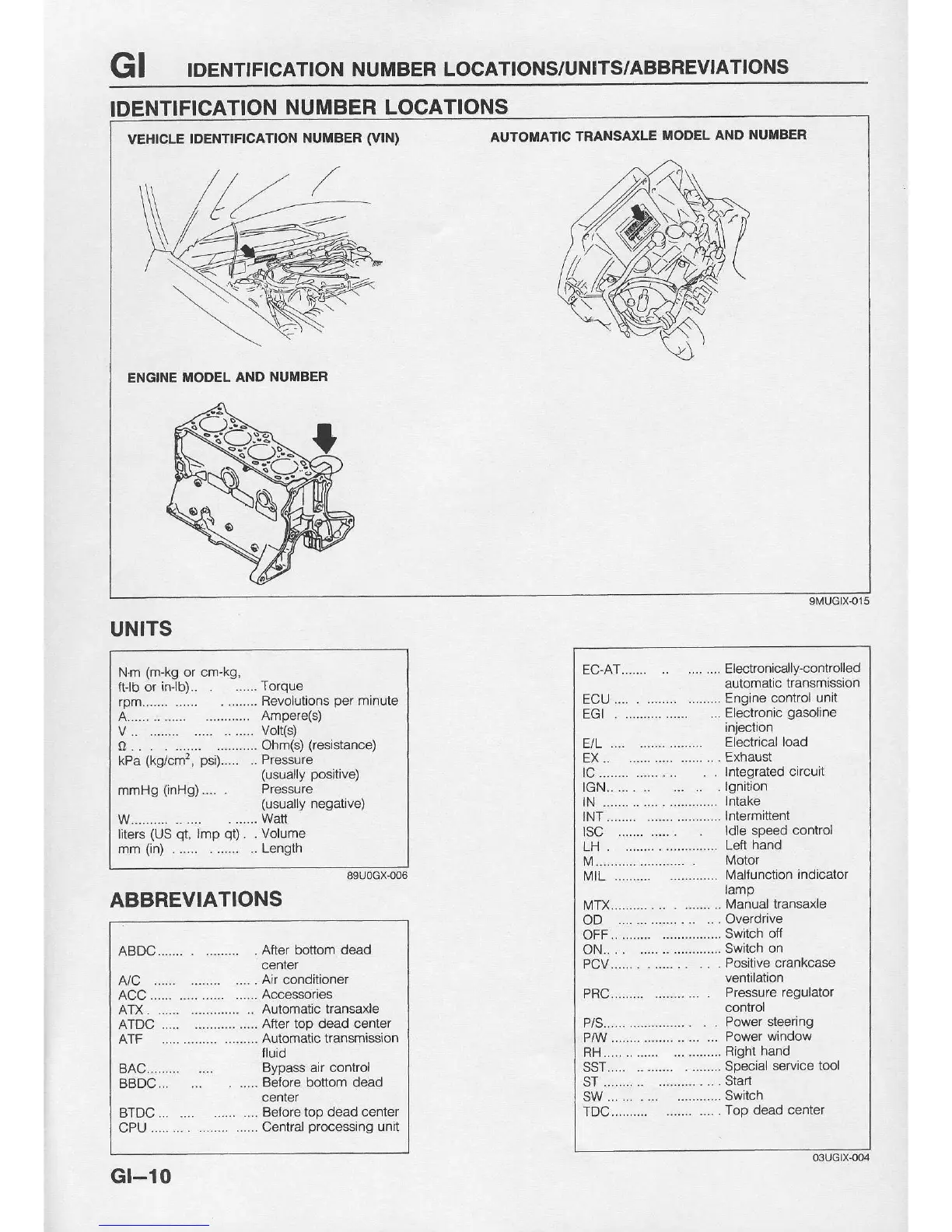 Mazda 121 - Identification Number Locations; Units; Abbreviations; Automatic Transaxle Mode1
