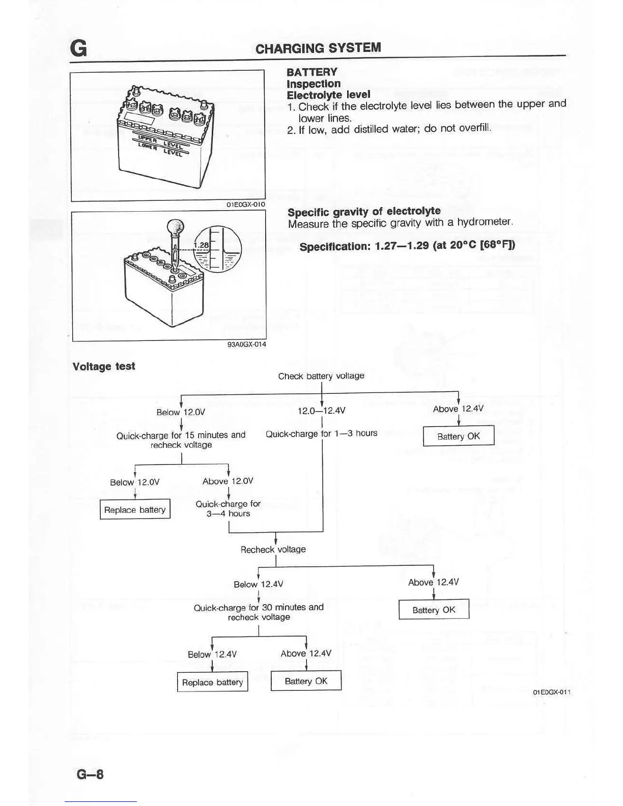 Mazda 121 - Battery Inspection; Electrolyte Level; Specific Gravity of Electrolyte; Voltage Test