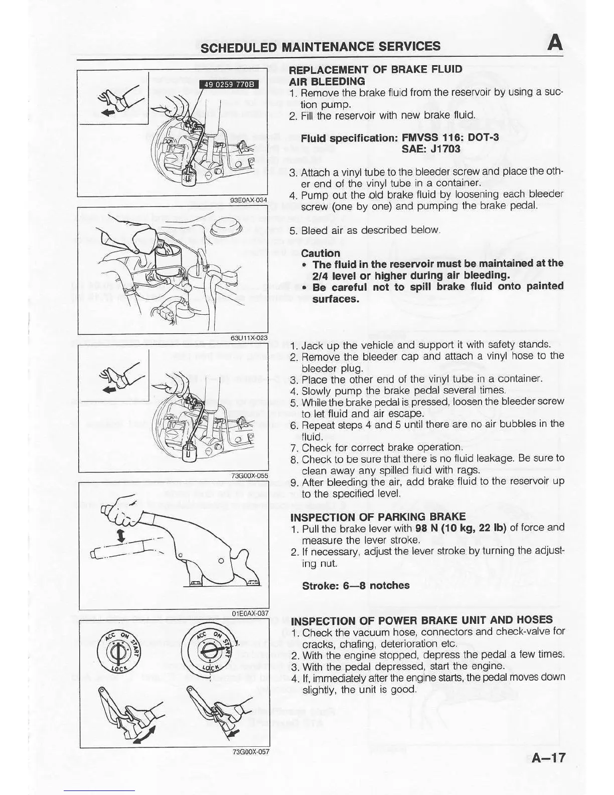 Mazda 121 - Replacement of Brake Fluid Air Bleeding; Inspection of Parking Brake; Inspection of Power Brake Unit and Hoses