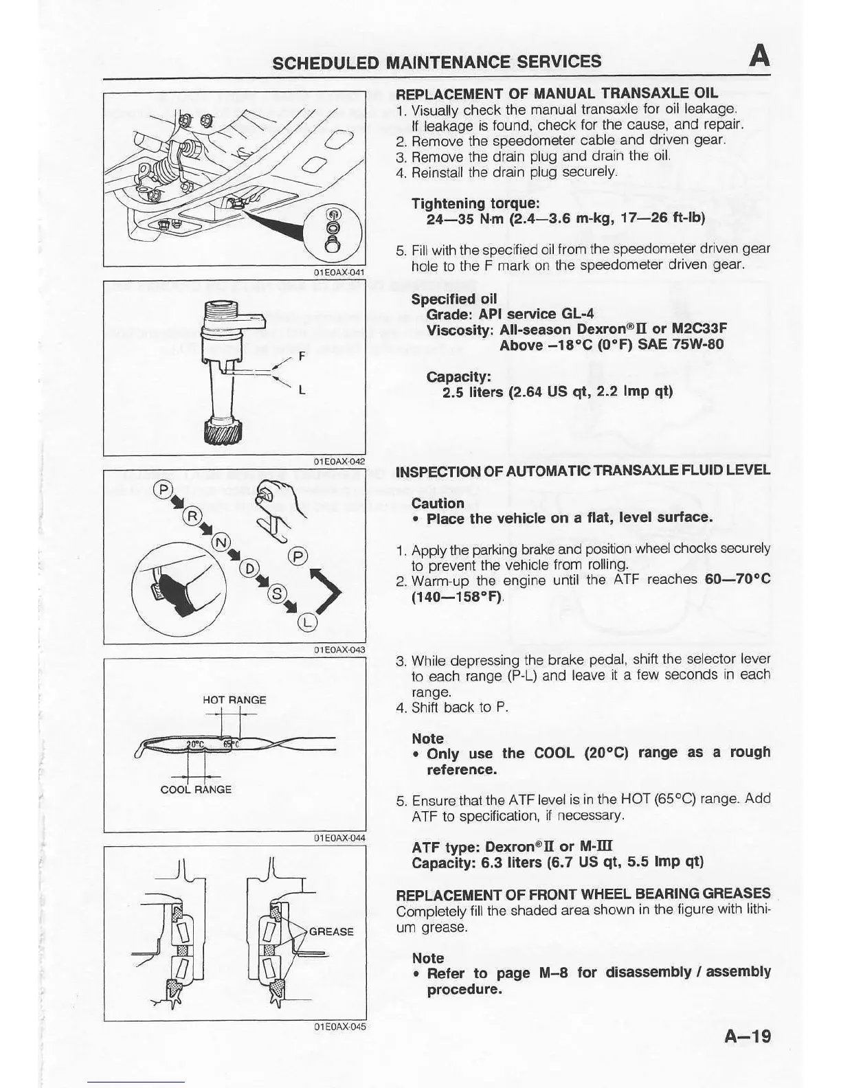 Mazda 121 - Replacement of Manual Transaxle Oil; Inspection of Automatic Transaxle Fluid Level; Replacement of Front Wheel Bearing Greases