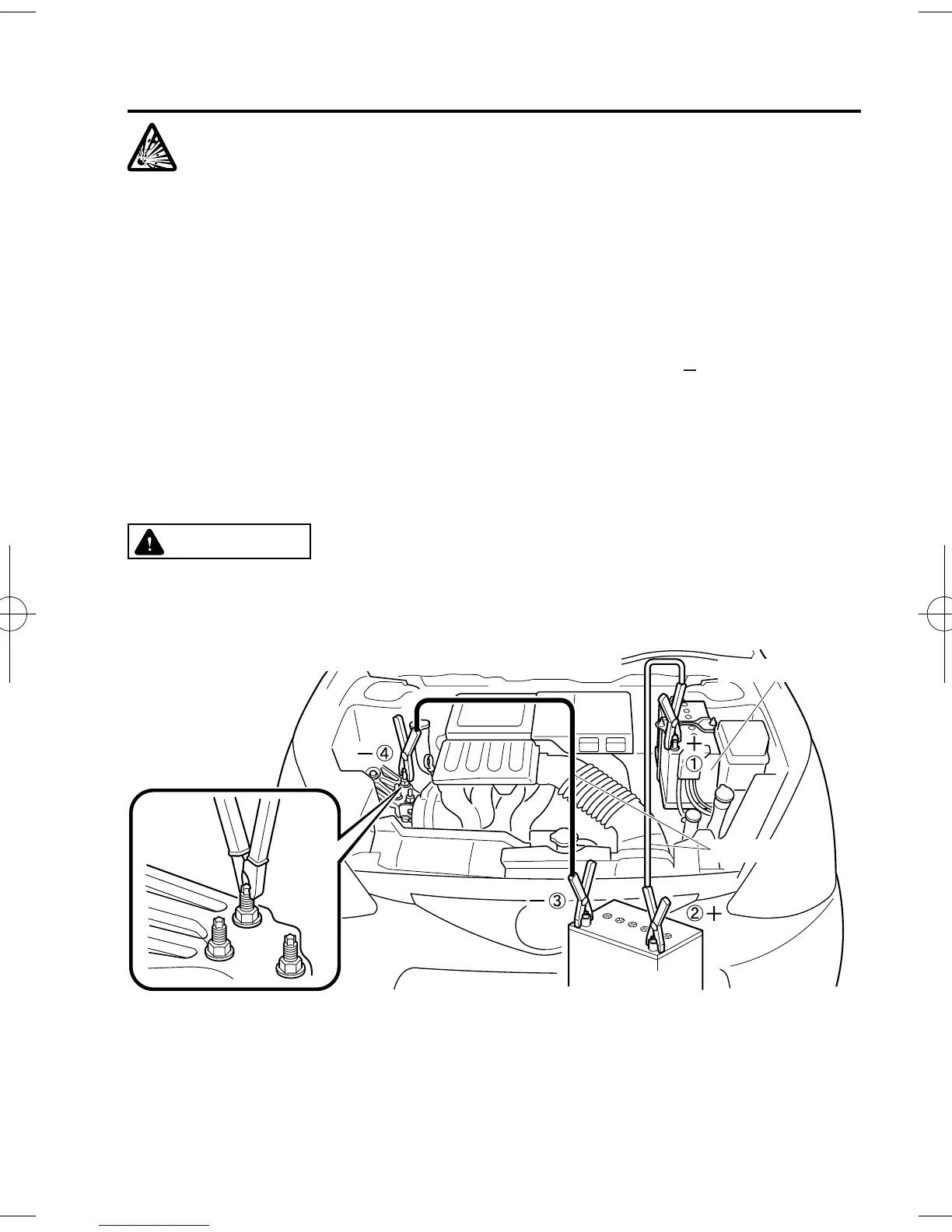 Do not jump-start a frozen battery or one with a low fluid level: