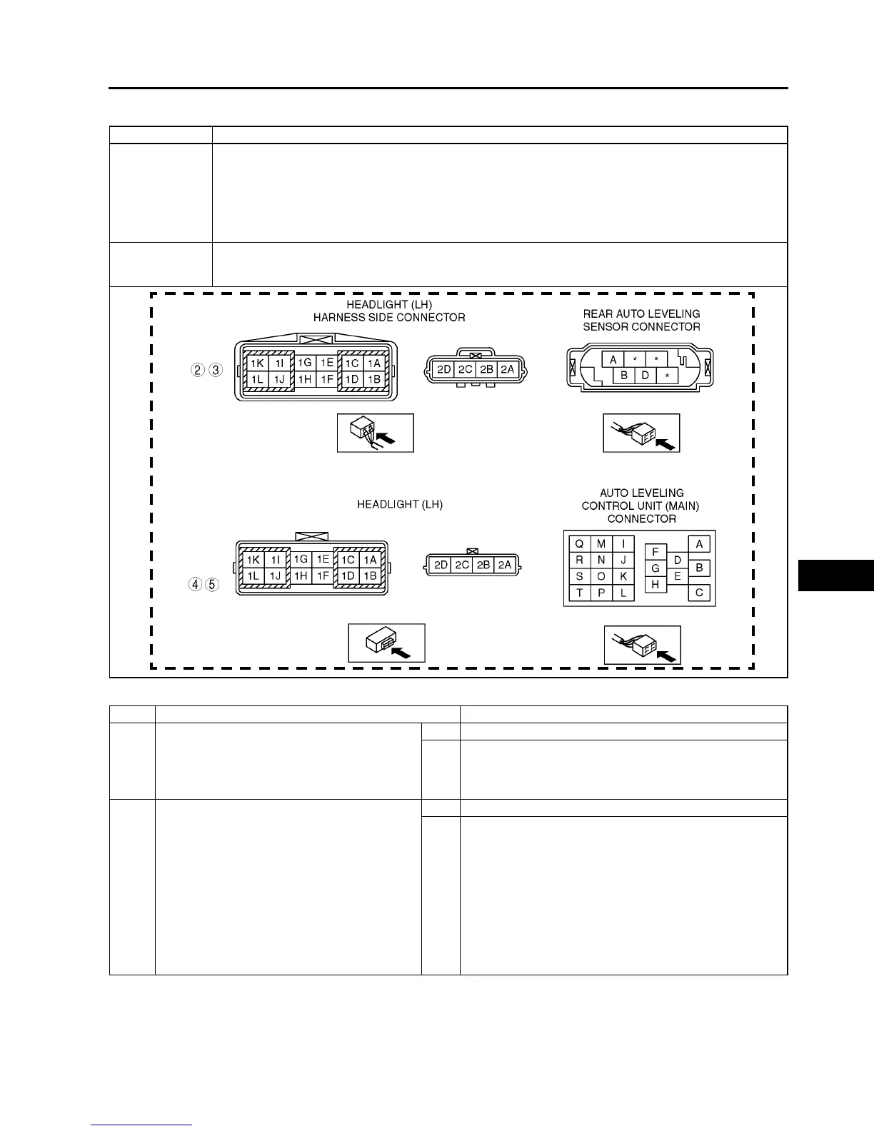 • Open or short circuit in wiring harness between rear auto leveling sensor and headlight (LH)