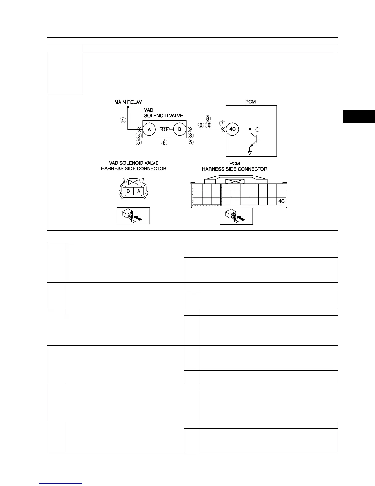 • Open circuit in wiring between VAD solenoid valve terminal B and PCM terminal 4C