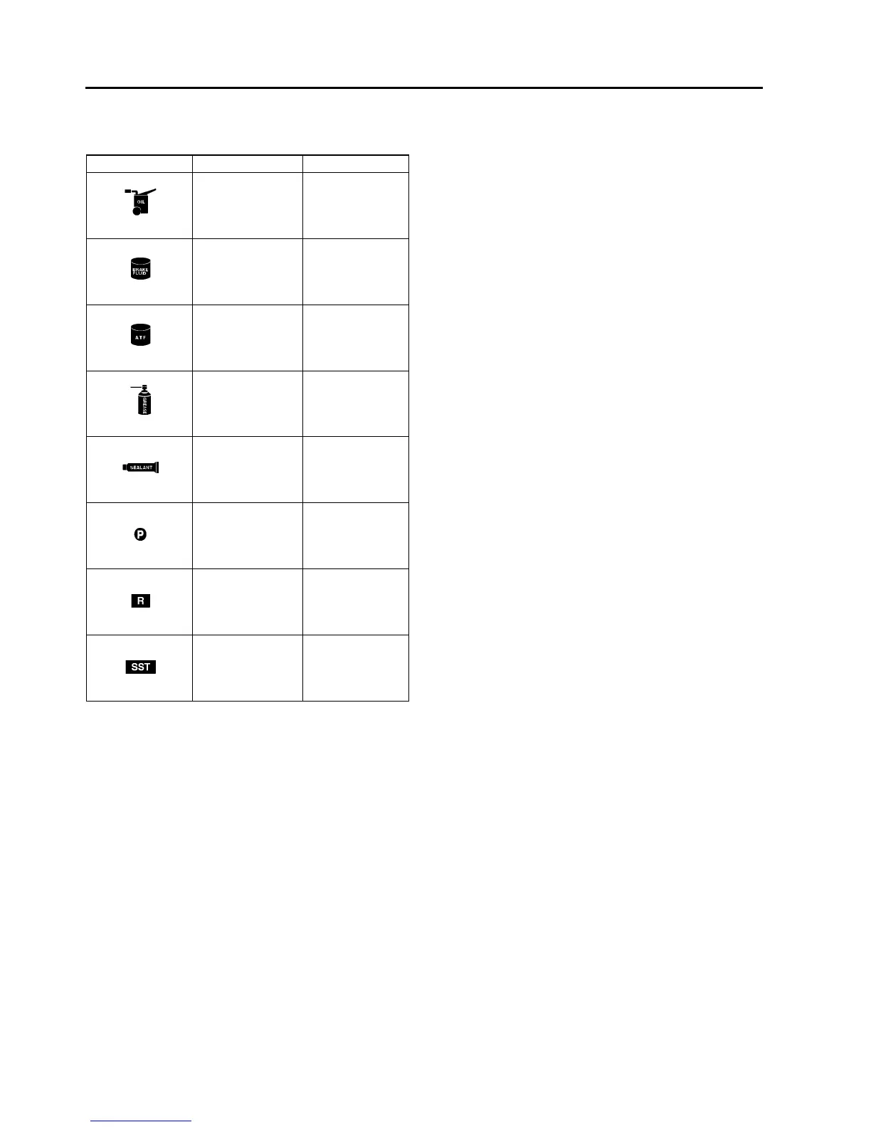 • There are eight symbols indicating oil, grease, fluids, sealant, and SST or equivalent use. These symbols show