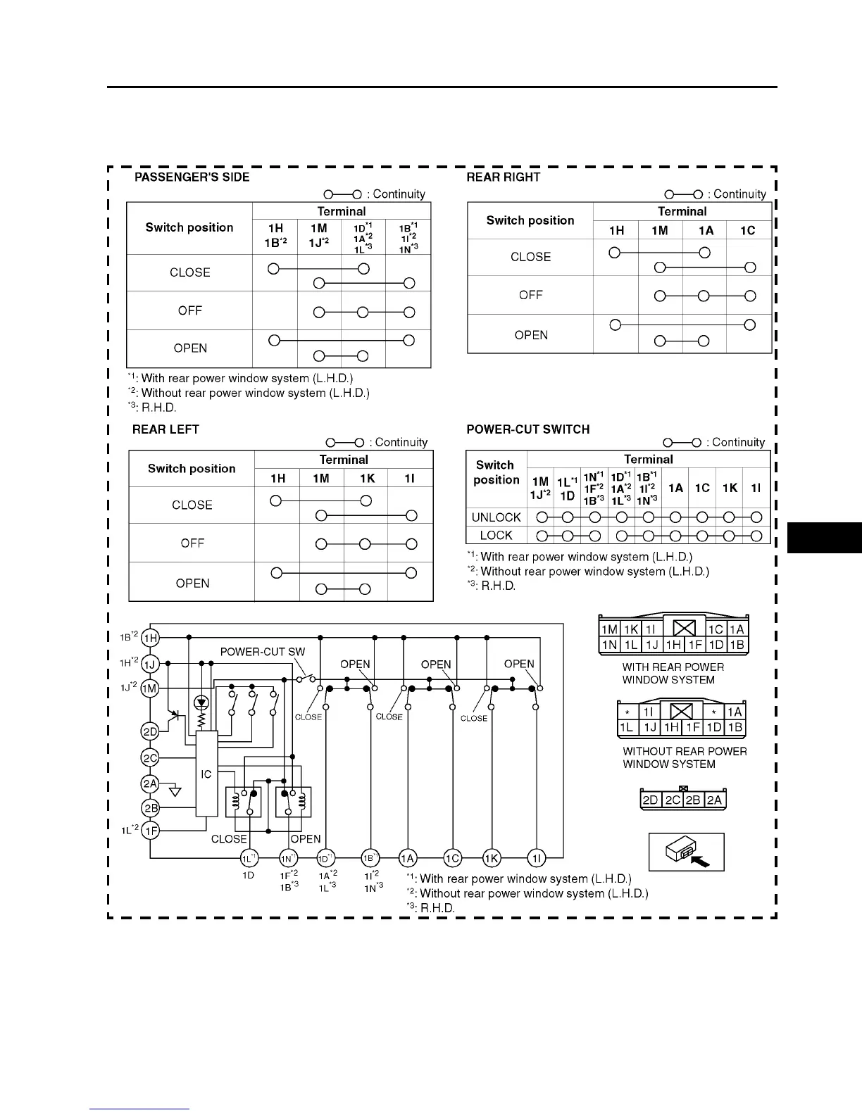 2. Inspect for continuity between the power window main switch terminals using an ohmmeter.