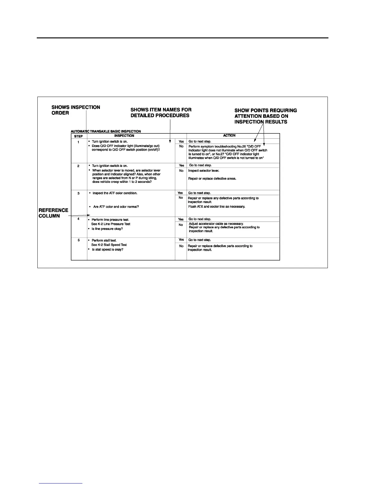 • The reference column lists the location of the detailed procedure for each basic inspection.