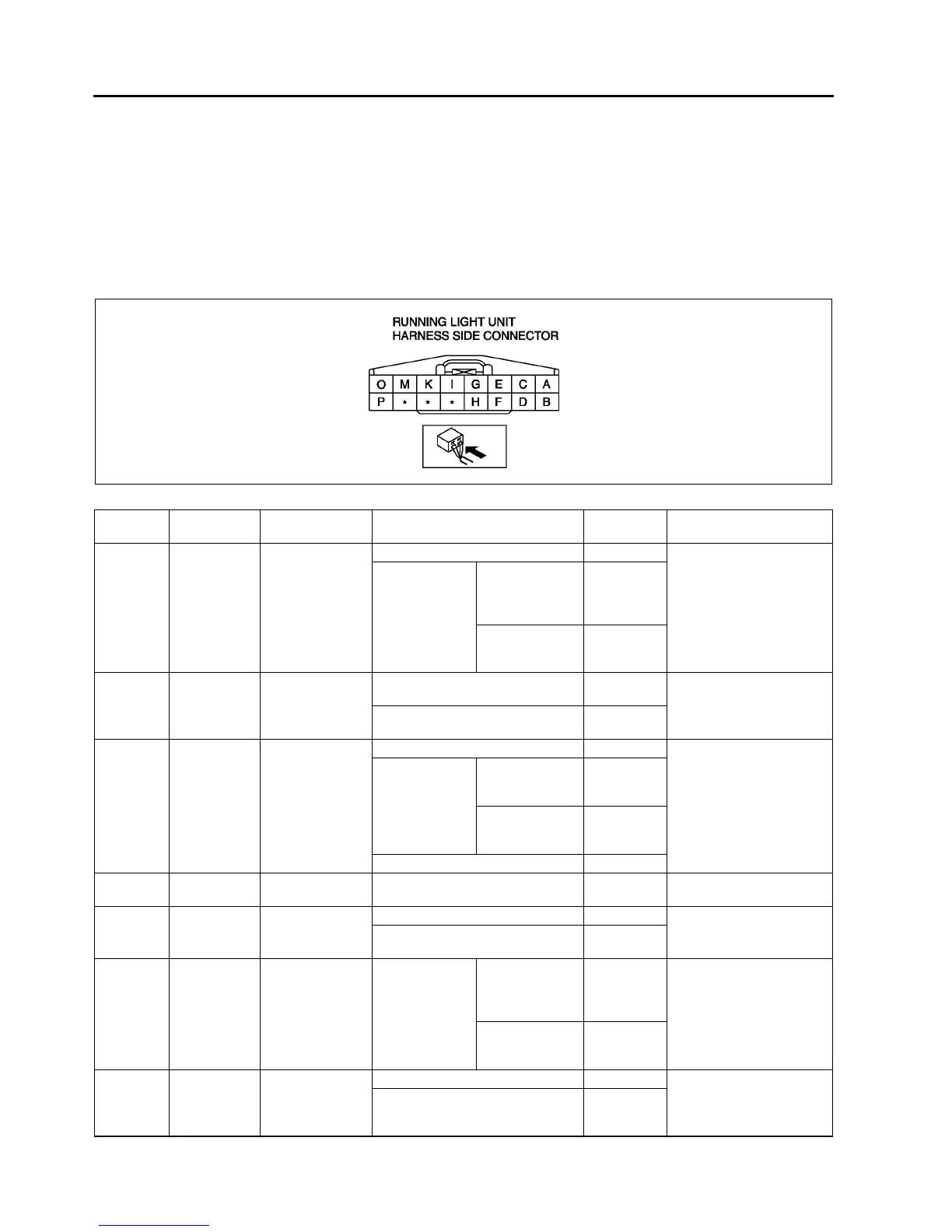 • When inspecting terminal D, H or P for continuity, disconnect the running light unit connector.