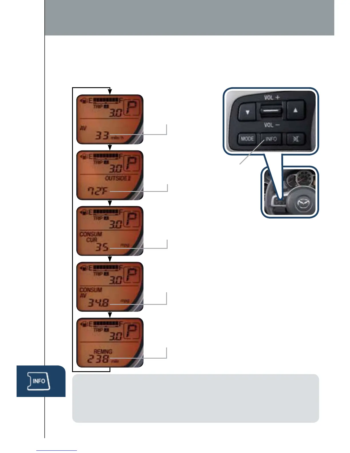 • To clear Average MPH or Consumer Avg. MPG, push and hold INFO button
